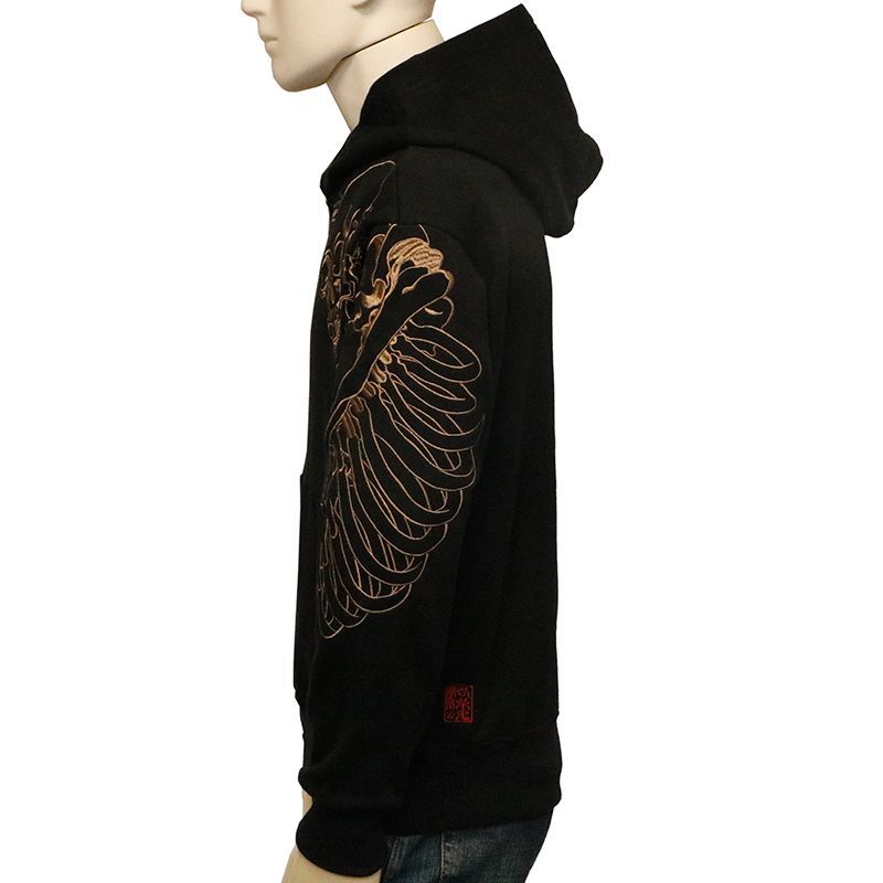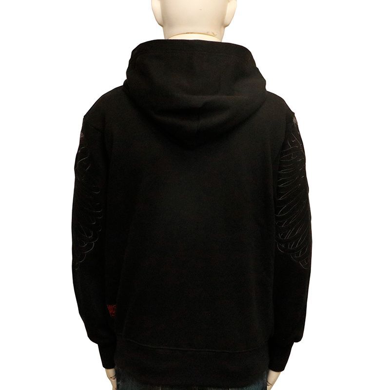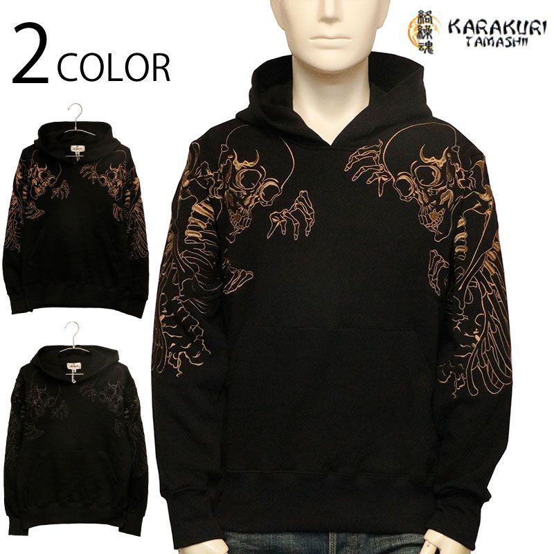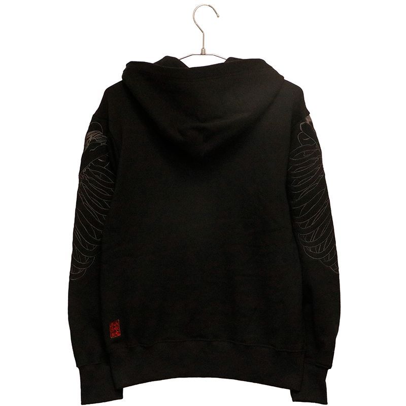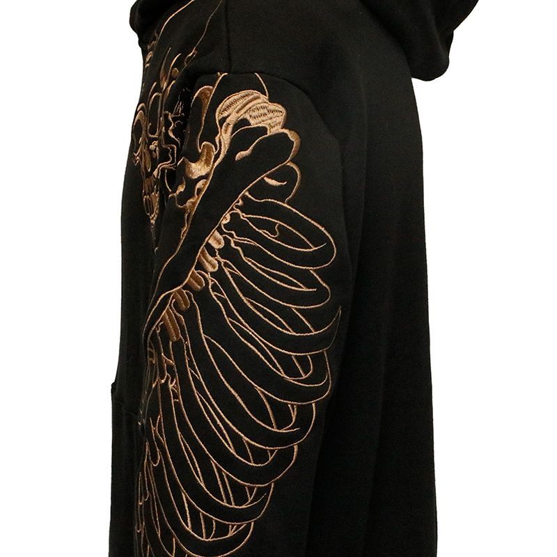 両肩にがしゃ髑髏を刺繍したプルパーカー。