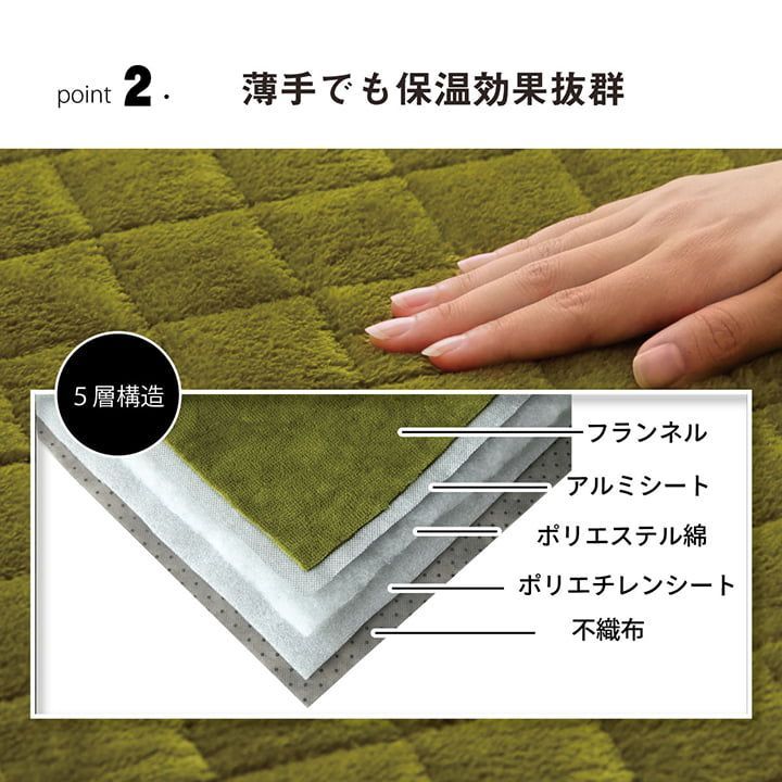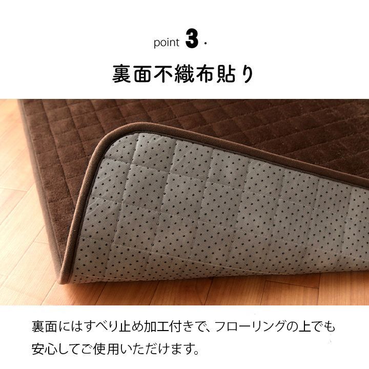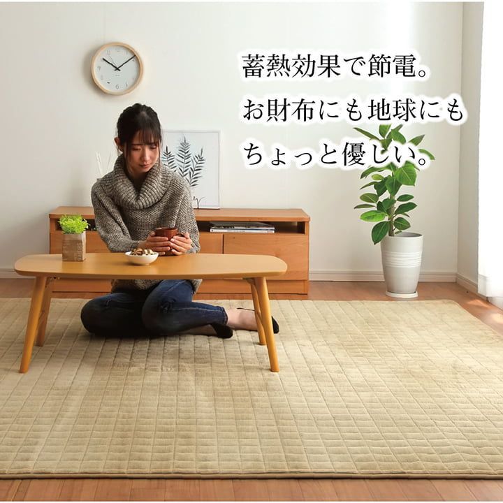 表地は保温性のあるフランネル生地で,ずっと触っていたくなるようなやわらかな肌触りです。中材にアルミシート・ポリエチレンシートを使用することで蓄熱・断熱機能があるため,冬の寒い日でも床からの底冷えを軽減します。無地でカラーバリエーションも豊富なため,どのようなお部屋にも合います。