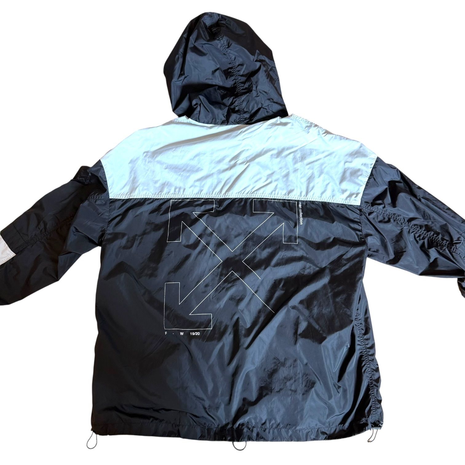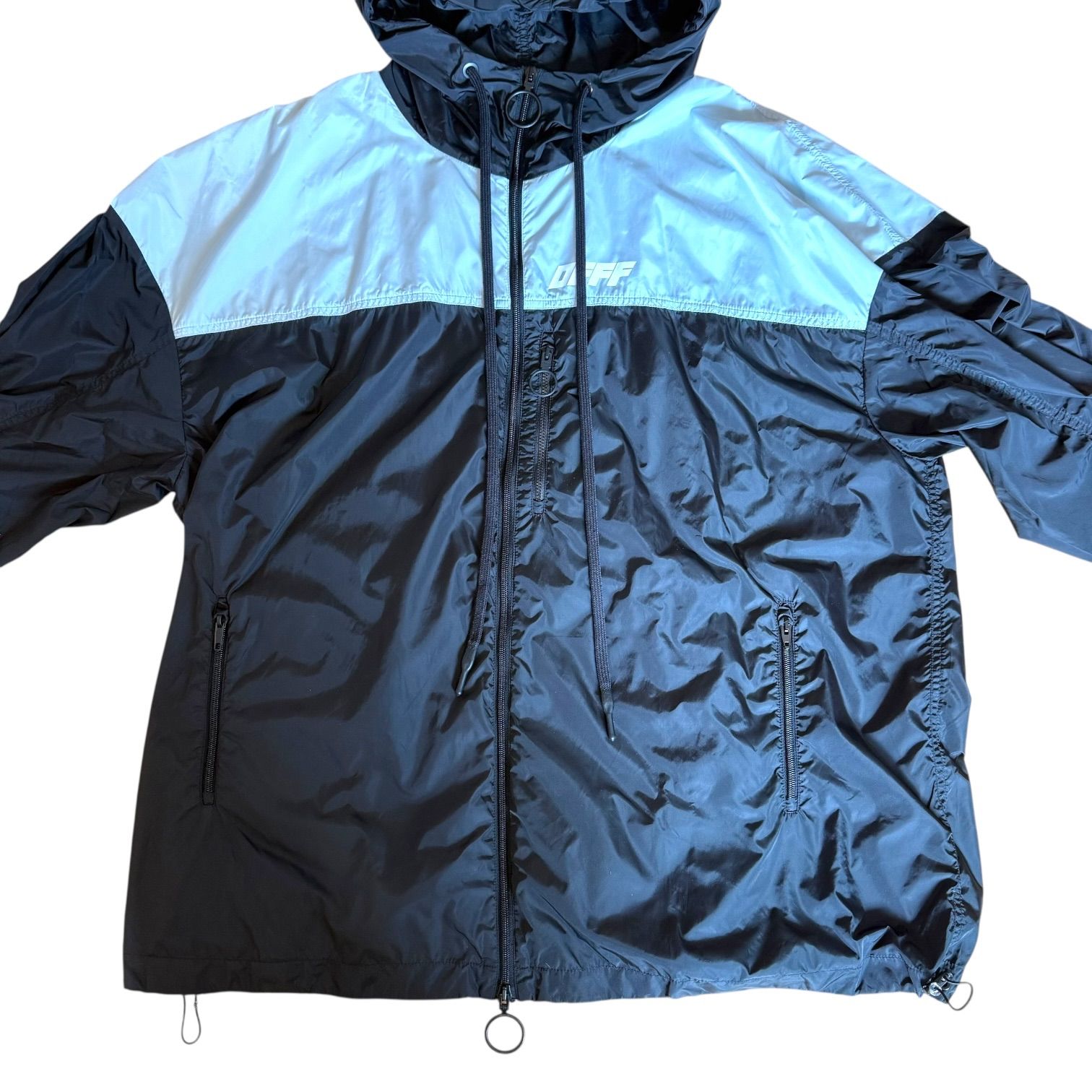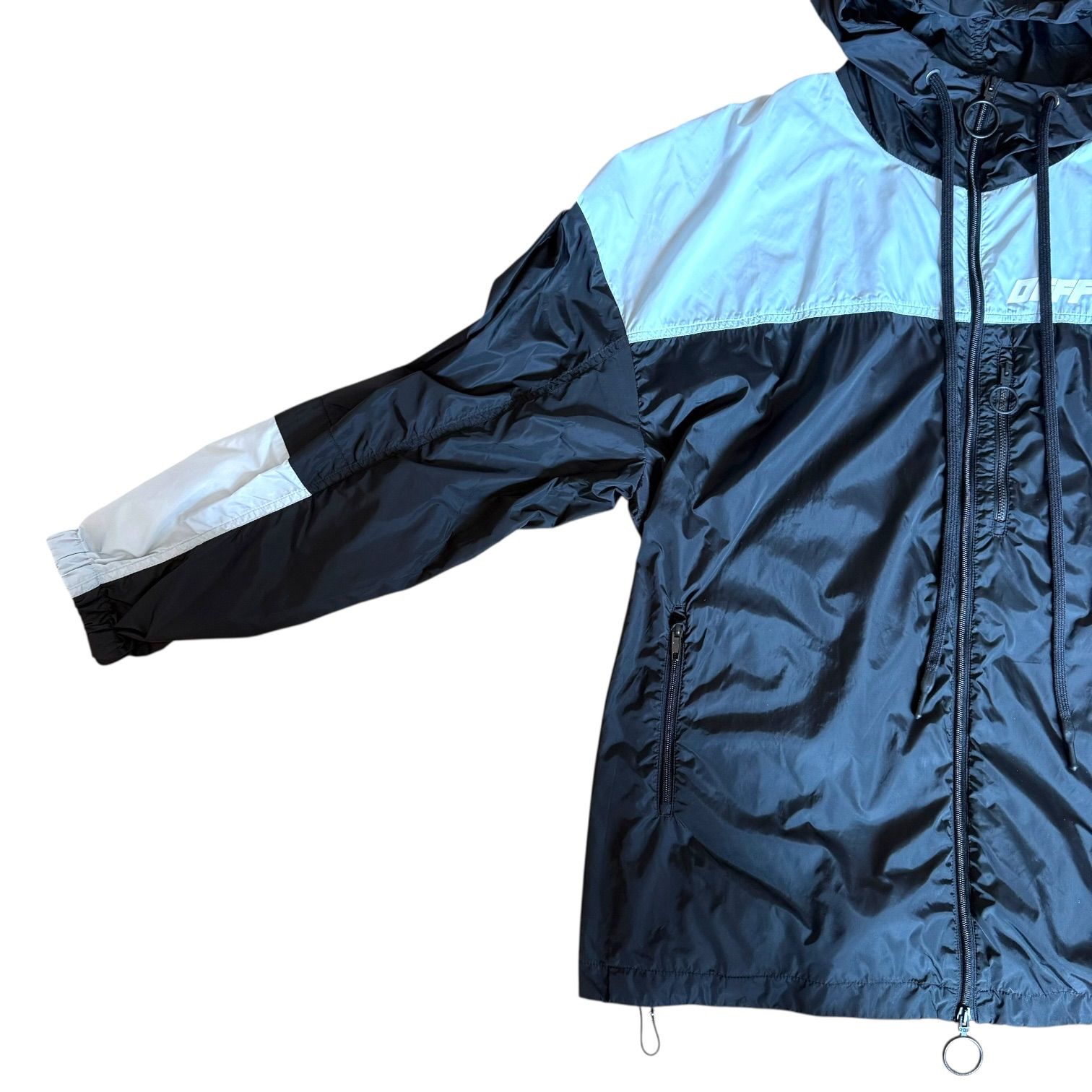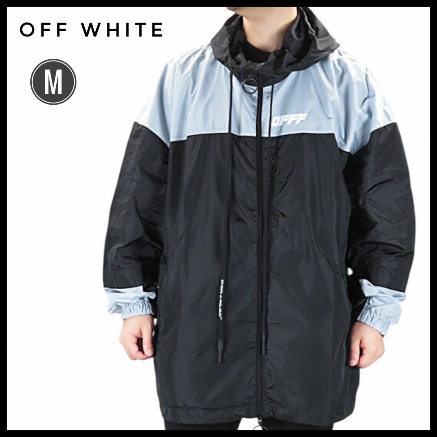 OFF-WHITE オフホワイト アウター ウィンドブレーカー ナイロンジャケット Mサイズ ジップアップ 防寒 ブラック シルバー アウトドア 男性 メンズ オーバーサイズ パリアミド 秋 冬 登山 キャンプ フード付き 中古