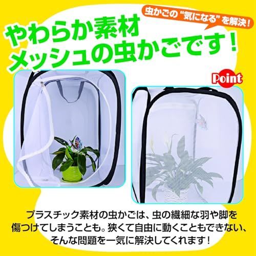 プラスチック素材の虫かごだと、昆虫の繊細な羽や脚を傷つけてしまうことも。狭くて自由に動くこともできません。そんな問題を一気に解決してくれる、やわらか素材、メッシュの虫かごです!