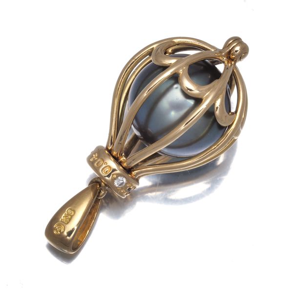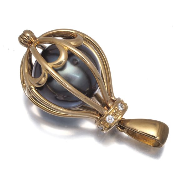 メタリックな輝きを披露するブラックパールの輝きをカゴに閉じ込めたタサキのペンダント。セレクトされたひと珠は多少のエクボがございますが美しいテリを魅せ、ゴールドとの美しきコントラストが胸元を演出します。