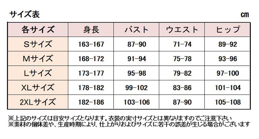 サイズ:こちらの衣装は男性サイズ寄りになります。女性サイズご希望の際は1、2サイズ落としてご注文されることをお勧めいたします。