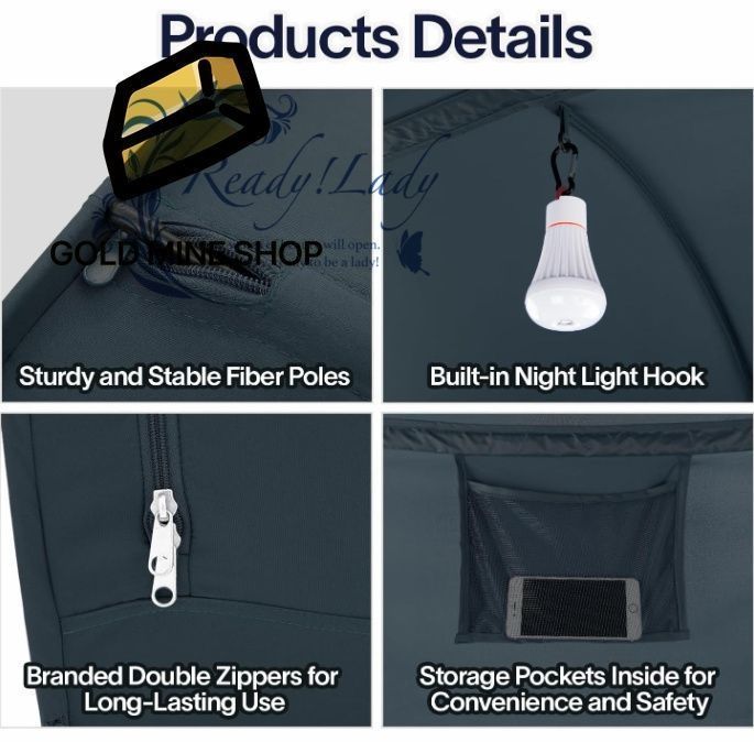?細部にこだわり:優れた素材を採用でテントを何時でもピンとしている。ポリエステルポンジーを使い、生地を柔らかくさせて、肌さわりが優しい。遮光生地で快眠グッズとしてより良い睡眠をとれる。窓とドアにファスナー付きで、ご自由に開閉できる。窓の上半部に半円メッシュがあり、蚊帳としても大活躍。内部にランタンフックと小物いれポケットがついて、より自分のプライバシーテントになれ、自己ペースで時間を過ごせる。