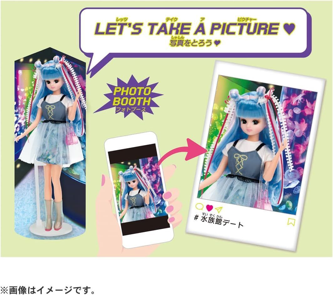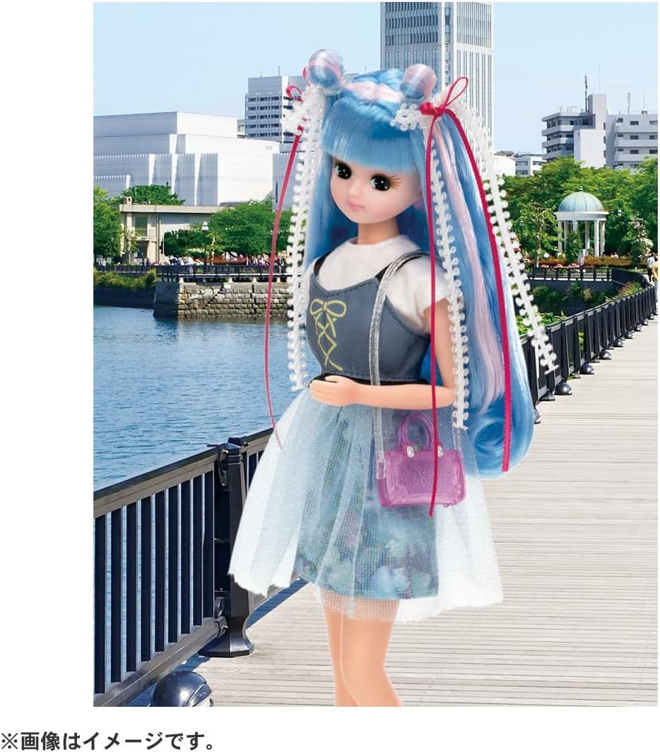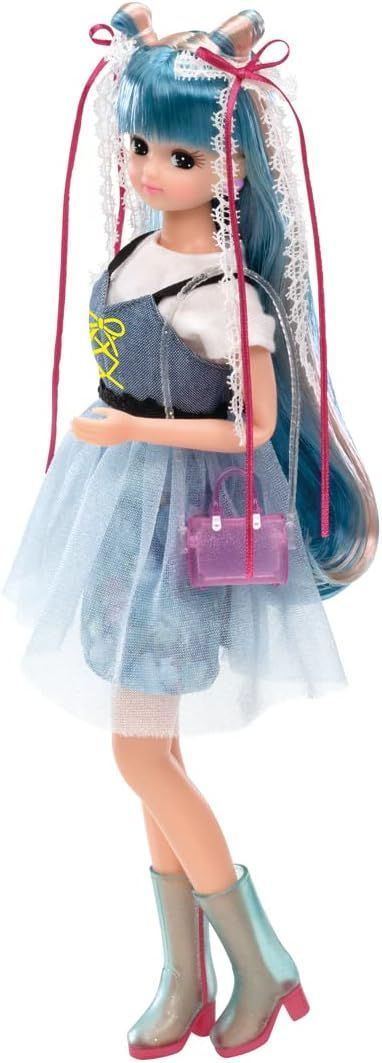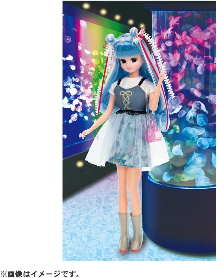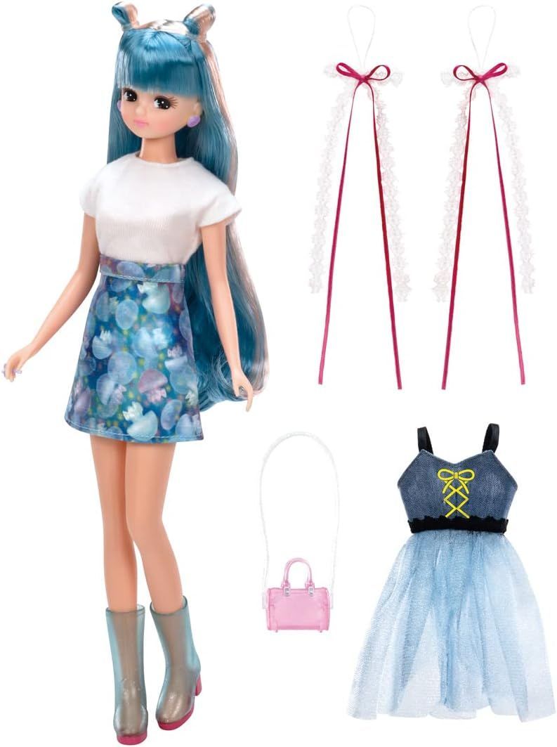 海の色のロングヘアの#Licca(ハッシュタグリカ)は白いシャツとくらげ柄のミニスカートに透け感のあるさわやかなビスチェをコーディネート。透明素材のブーツ、ミニショルダーバッグ、2色のリボンを重ねた長めのヘアアクセサリーが付属します。背景シート、スタンド付き。
