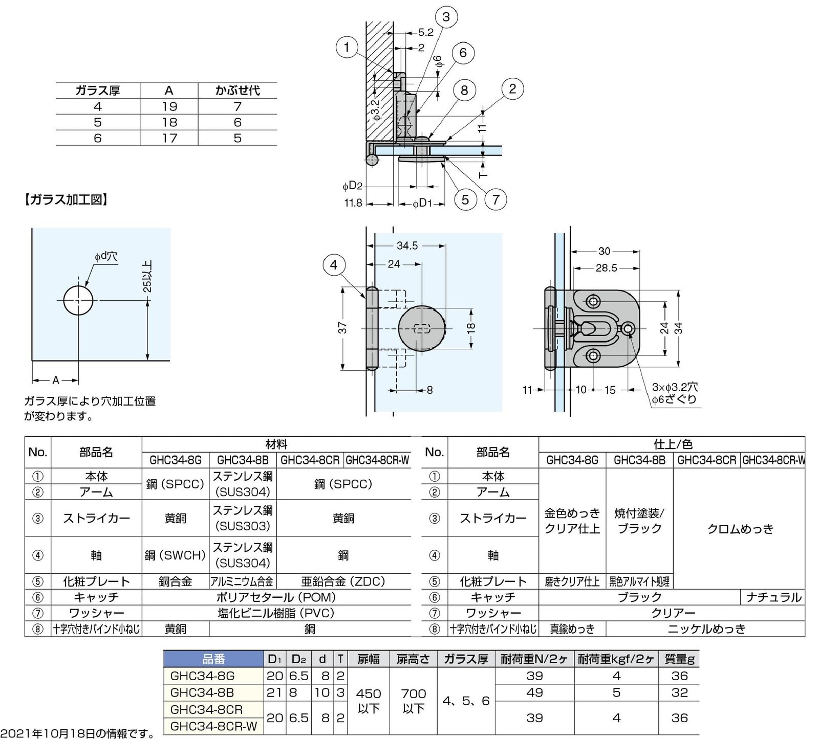 スガツネ工業 ランプ印 キャッチ付 ガラス丁番 GHC34-8型 かぶせ扉用 GHC34-8CR 銀