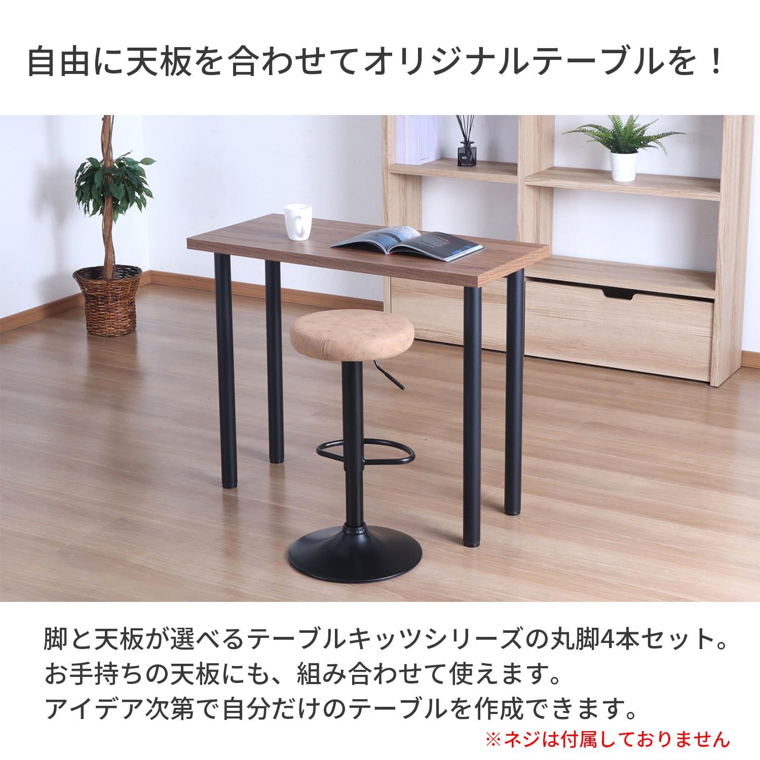 天板は別売りです。4本同時使用時の耐荷重は約100kgです。ドライバーとボルト(ネジ)は別途ご用意ください。天板の形状・脚の取付箇所・ネジの長さによって、耐荷重は前後しますのでご了承ください。