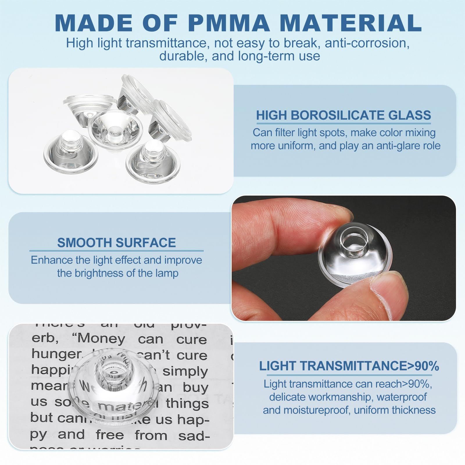 利点:光学アクリル素材で作られており、高い光透過率を持ち、破損しにくく、耐食性があり、耐久性があり、長期間使用できます; 光透過率が最大90%に達し、レンズは光出力を最大化し、より明るい照明を実現できます。 レンズの表面はフラットレンズで、光効果を向上させ、ランプの明るさを増やすことができます。