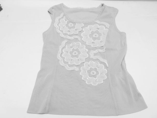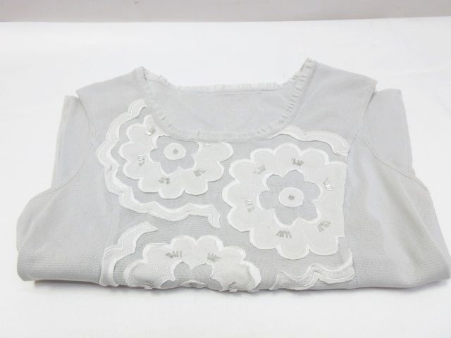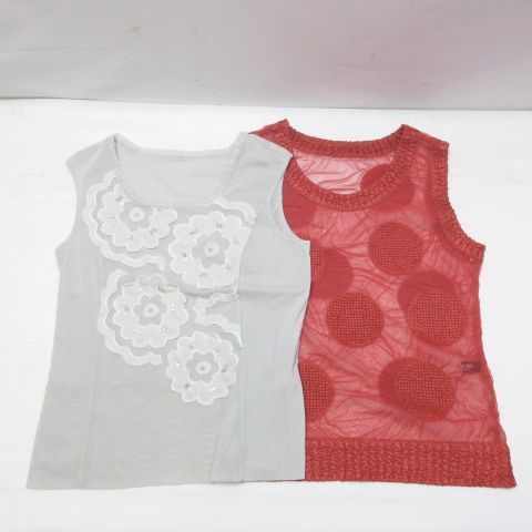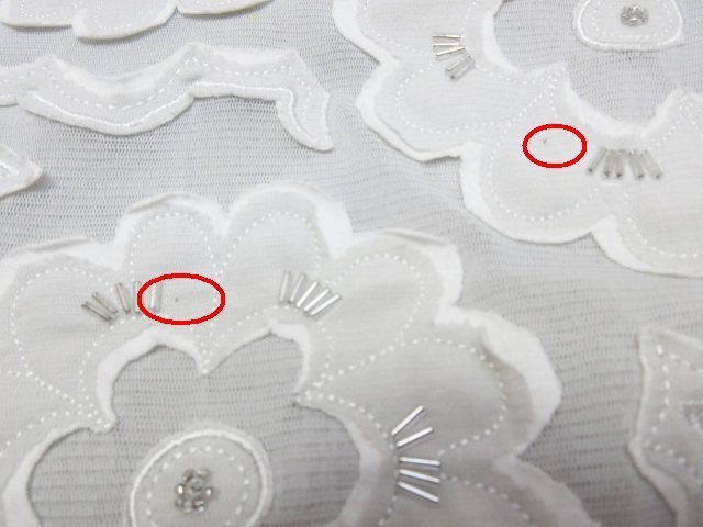 ①のグレー系のトップスに小さな汚れ、ビースに若干の変色がございますが、目立つものではないように思います。