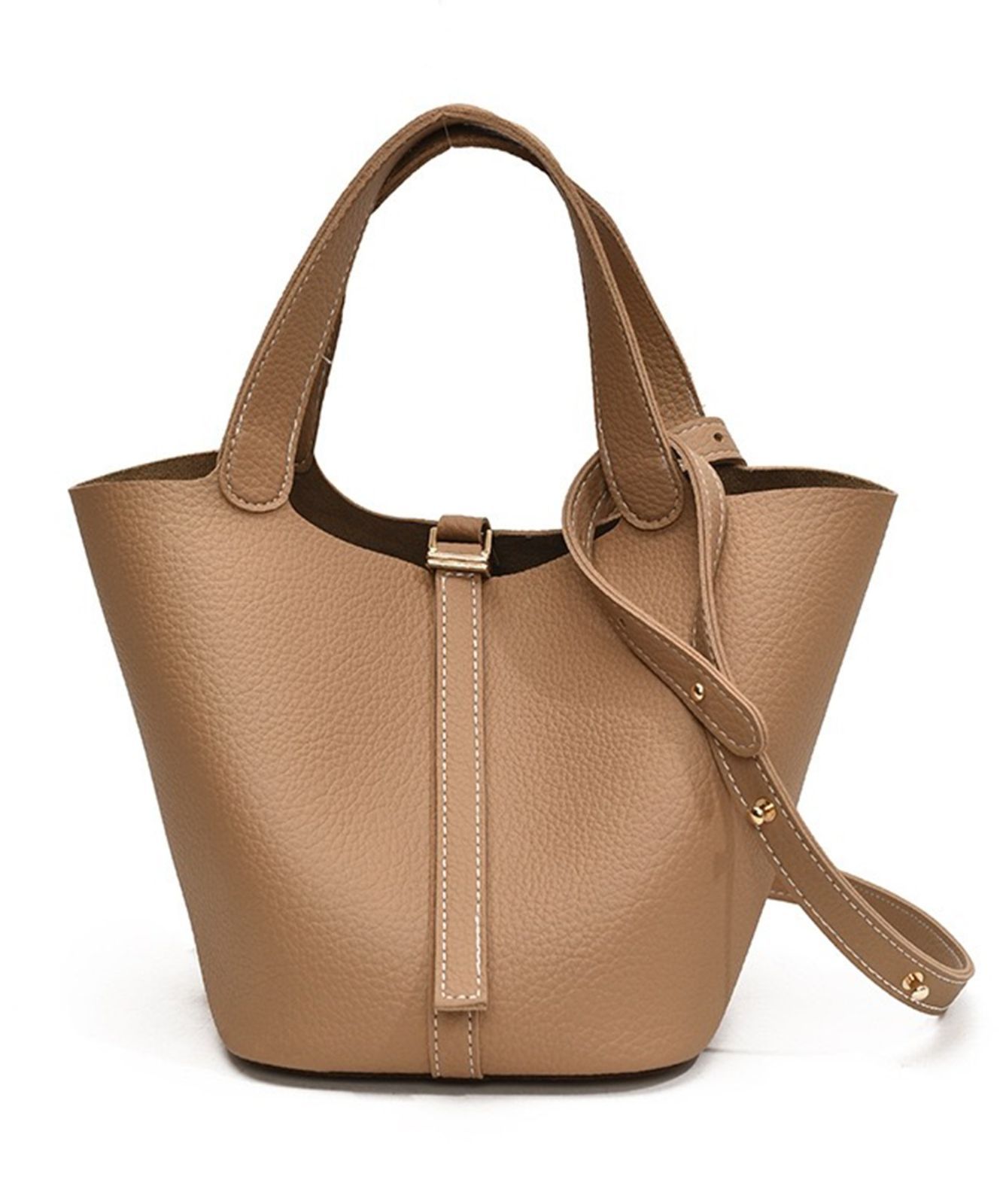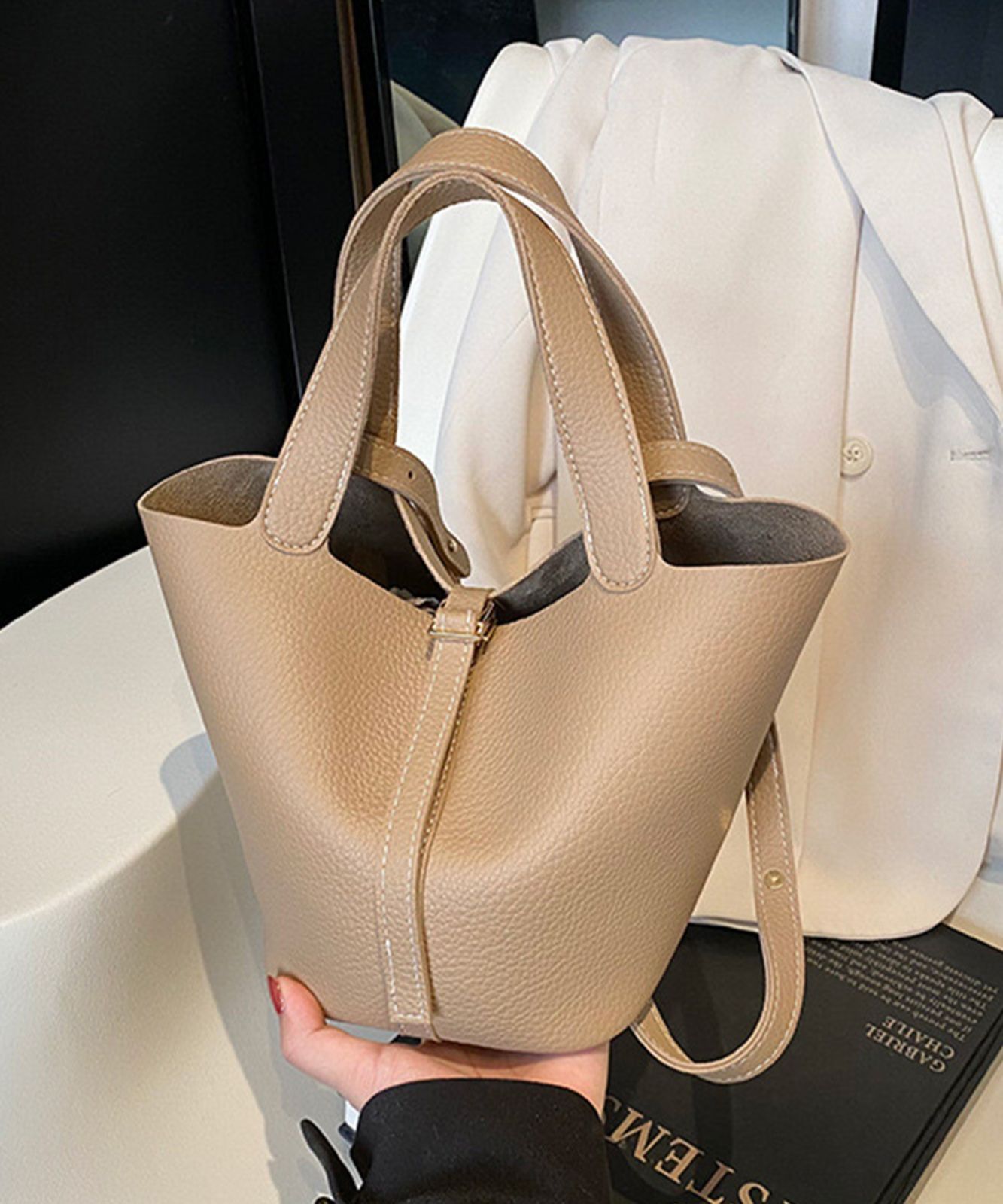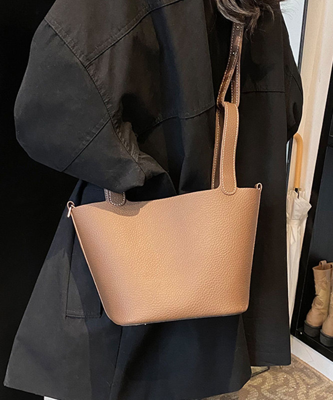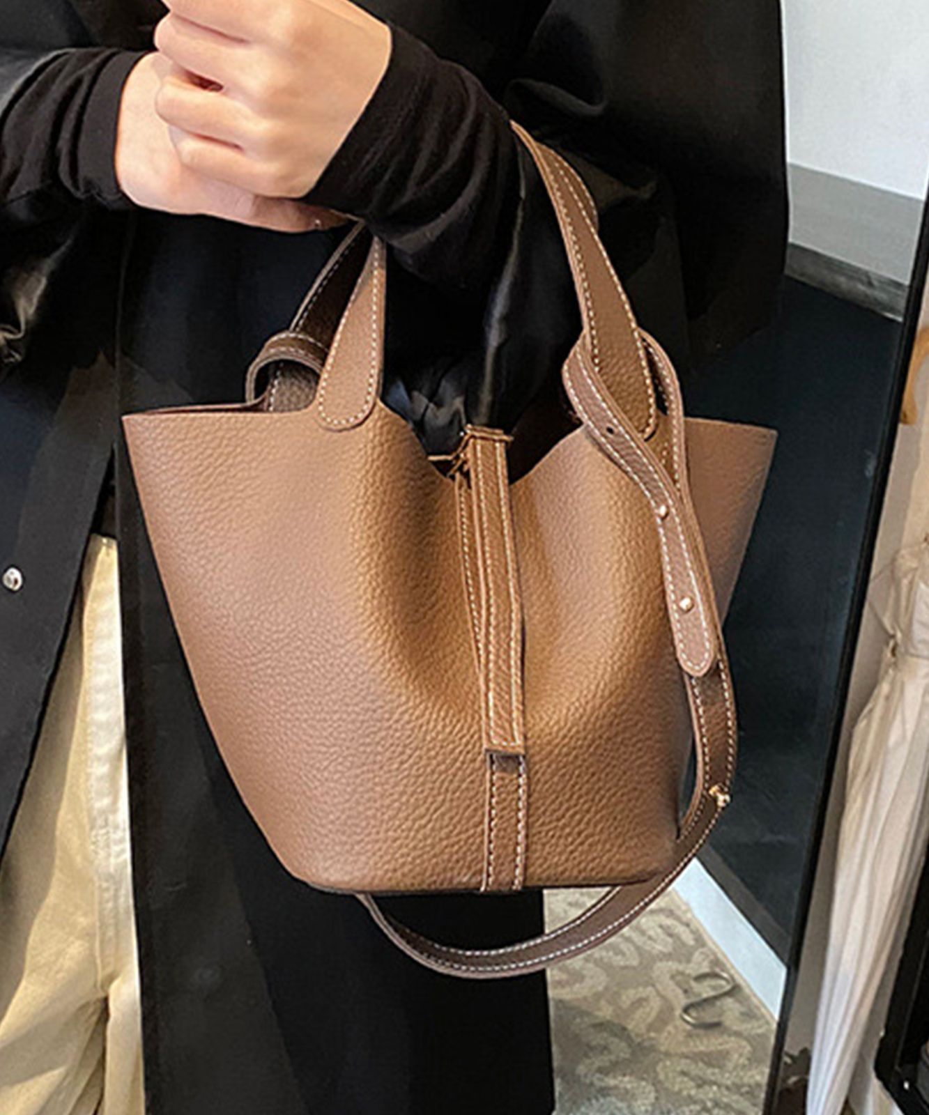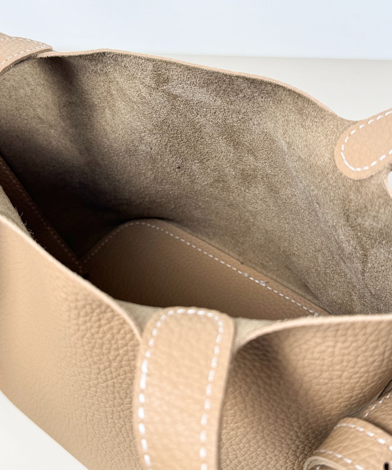軽量で扱いやすいフェイクレザーを使用し、シボ感のある質感は高見え効果抜群。ホワイトステッチがアクセントとして効いており、シンプルながら洗練された印象に。バッグ本体はしっかり自立し、底鋲付きで床置きにも強い実用性の高さがポイントです。