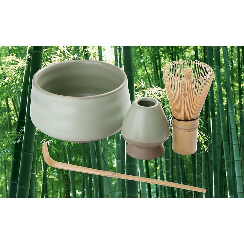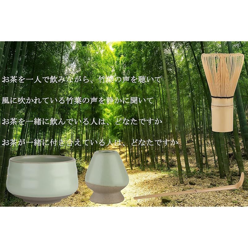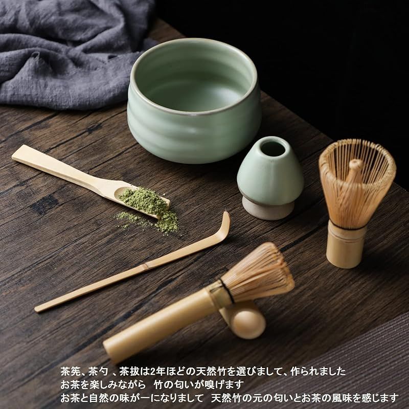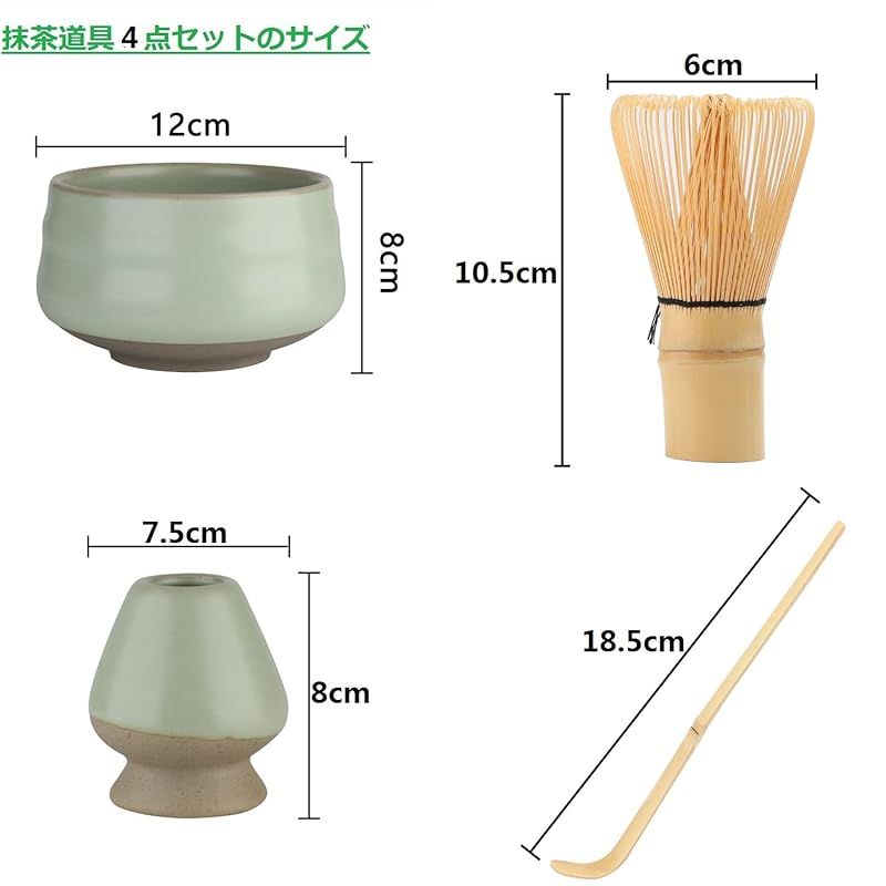 【4点セット内容】抹茶茶碗、茶筅(百本立)、 茶筅立て 、茶杓 【構成素材】抹茶茶碗、茶筅立ての素材は陶器です。 茶筅、茶杓の素材は天然竹で作られます。 【色】薄緑、霧白、真っ黒 お茶道具4点セット重量:(約)616.5g