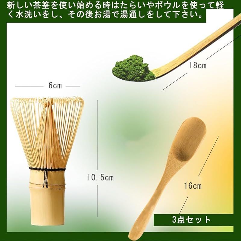 【セット内容】茶筅サイズ:直径6cm×高さ10.5cm、茶杓サイズ:縦18 cm×横1.5 cm、茶さじサイズ:縦16cm×横3cm。