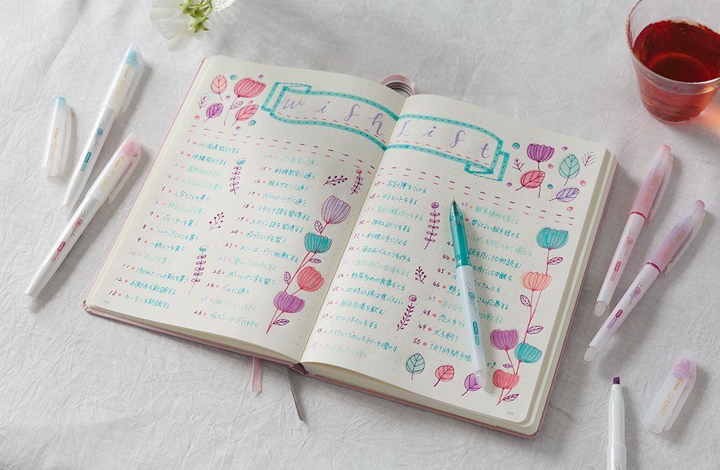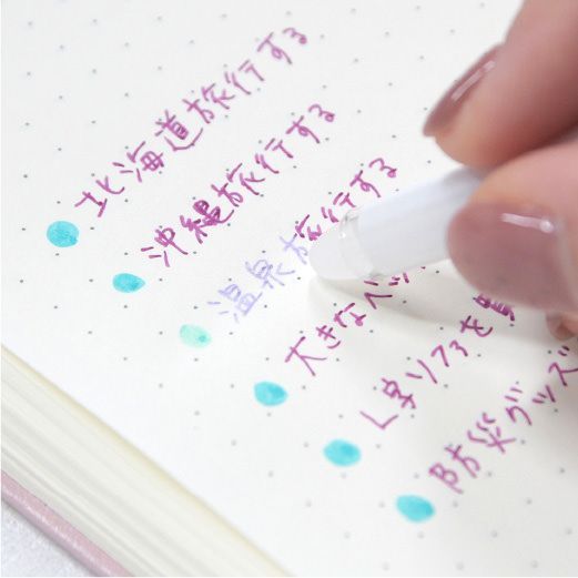 こすると紙面上のインキ色が変化するので、ノートや手帳などへの彩りをはじめ、自分の夢や願いを箇条書きにする「ウィッシュリスト」や仕事やプライベートの「To Doリスト」作りにも適しています。達成した願いや完了したタスクを専用ラバーでこすると筆跡の色が変わり、目標を叶えた達成感と色が変わるワクワクを感じながらお使いいただけます。