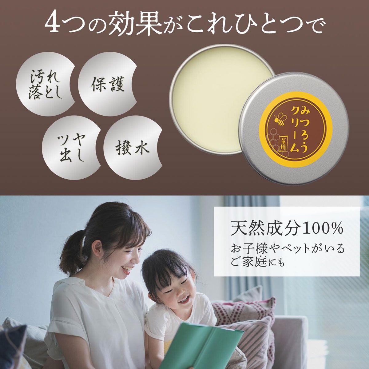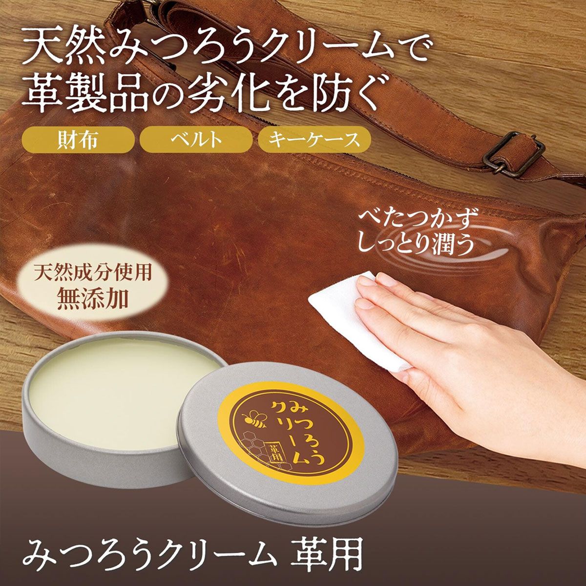革製品の保護、汚れ落とし、はっ水、ツヤ出しをこれ一本で!創業約80年の老舗油脂?メーカーと開発。天然成分100%のみつろうクリームでお子様やペットがいるご家庭にもおすすめ◎