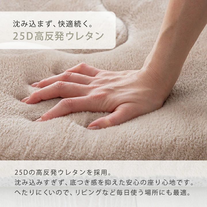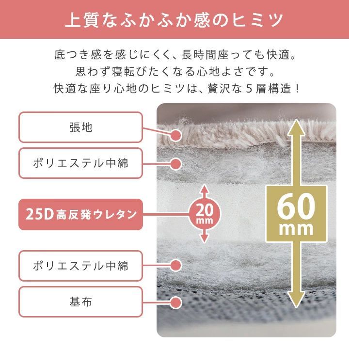 ・2cm厚の高反発ウレタンにたっぷりの中綿を重ねた贅沢な5層構造で底付き感を感じにくく、快適な座り心地を実現します。