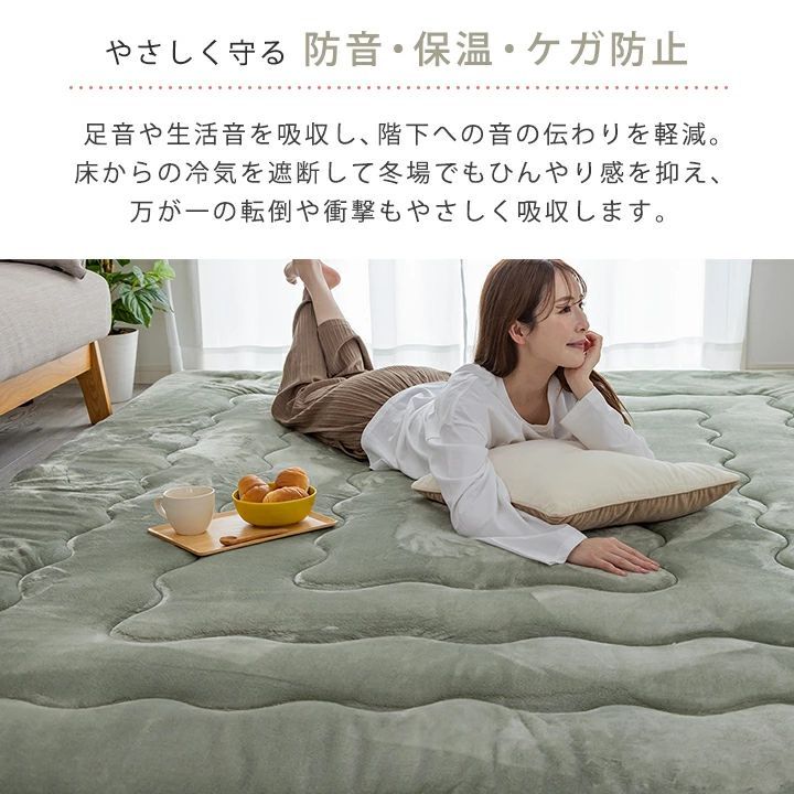・6cmの極厚ボリュームで足音などの生活音を軽減し、床からの冷気を遮断してひんやり感を抑え、万が一の転倒時の衝撃も優しく吸収します。