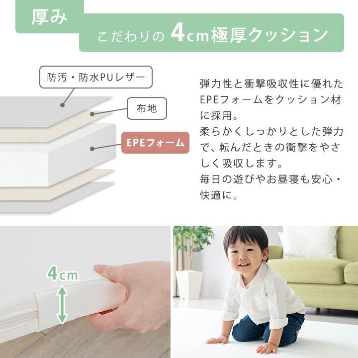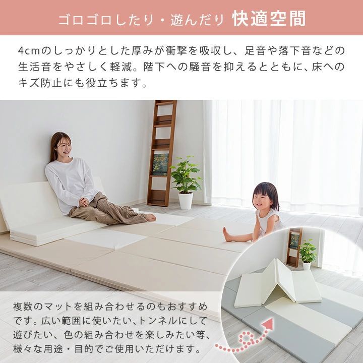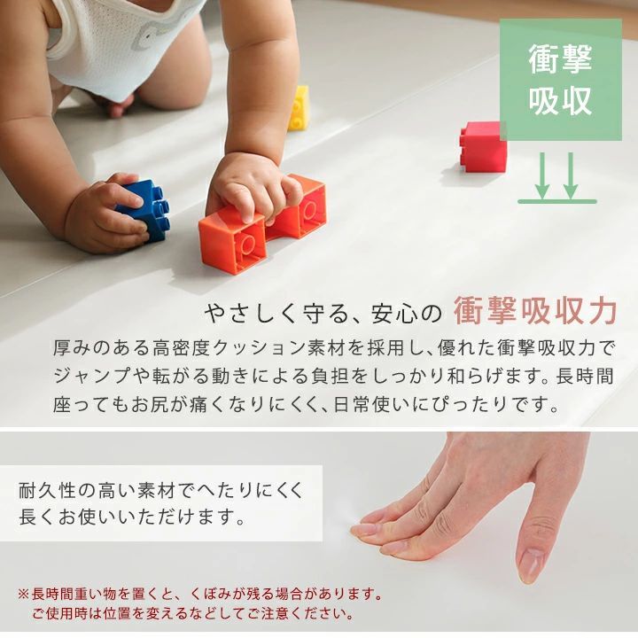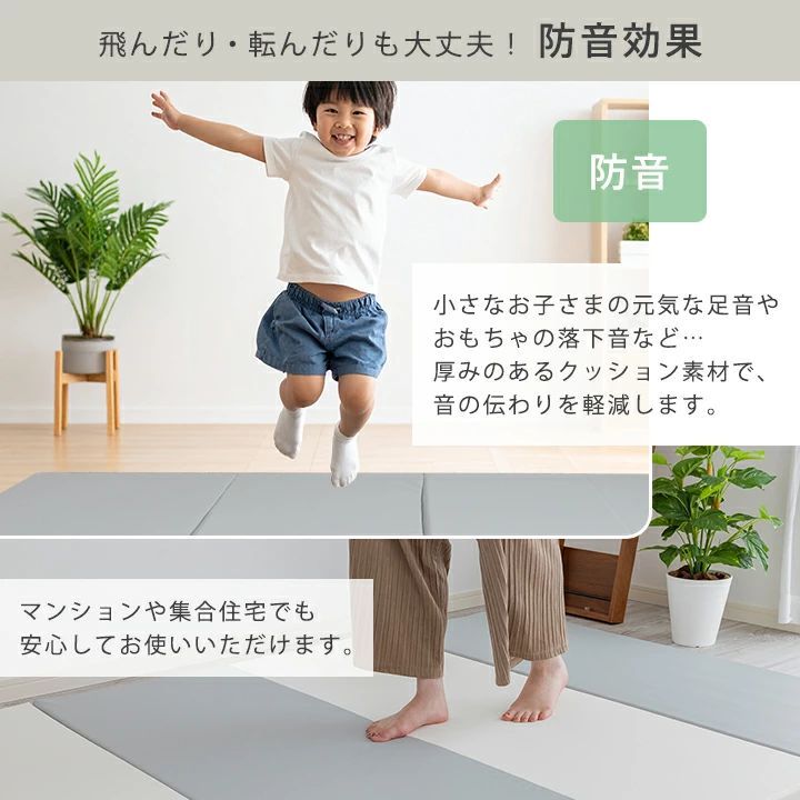 ・厚みのあるクッション素材でお子様の元気な足音やおもちゃが床とあたる音などを軽減し、二階建てのお家やマンションなどの集合住宅でも活躍します。