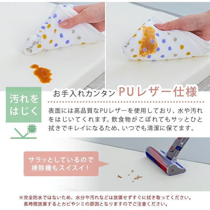 ・カバーには高品質なPUレザーを使用しているので食べこぼしなどの汚れが染み込みにくく、さっと拭くだけでいつでも清潔に保てます。