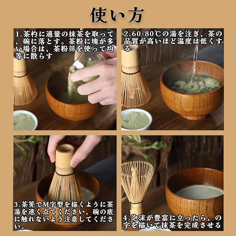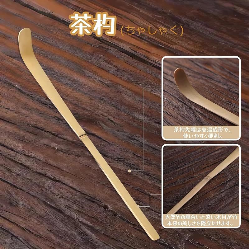 ??高品質な天然竹を使用した茶筅と茶杓は、職人が一本一本丁寧に手作り。化学塗装を使わず、自然の風合いをそのまま活かしました。繊細な穂先が抹茶パウダーをきめ細かく撹拌し、まろやかな口当たりと豊かな泡を生み出します。