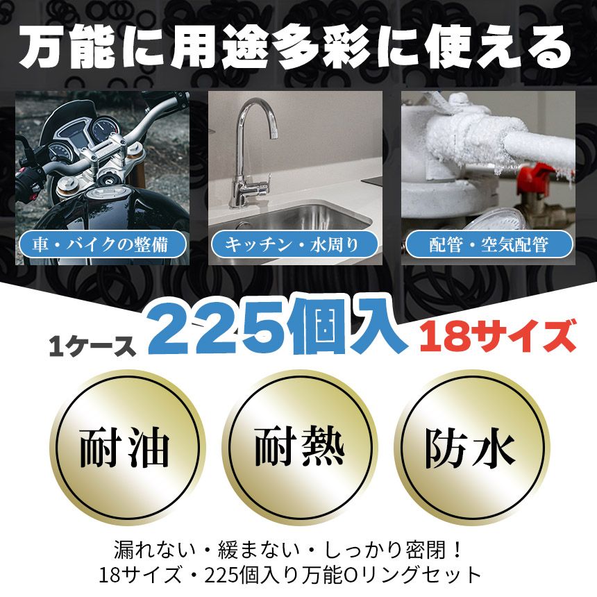 漏れない・緩まない・しっかり密閉!18サイズ・225個入り万能Oリングセット