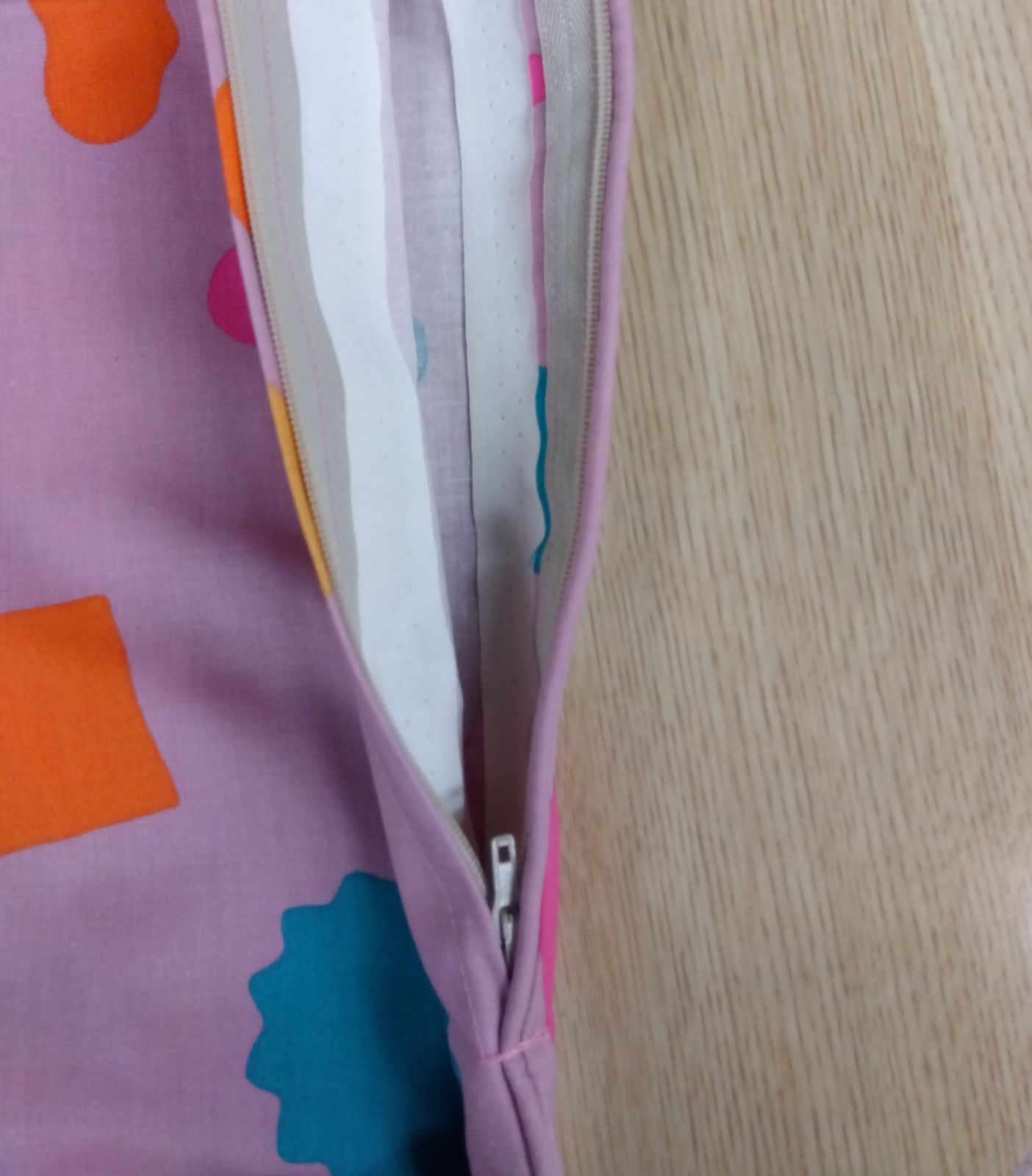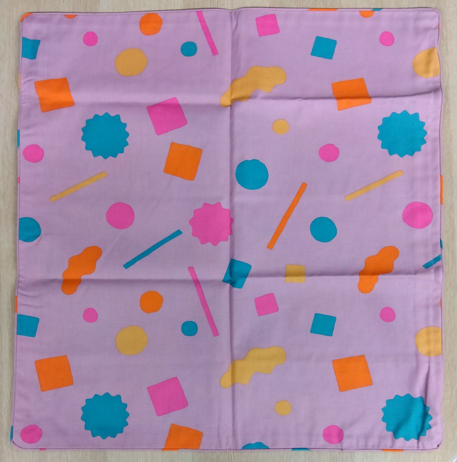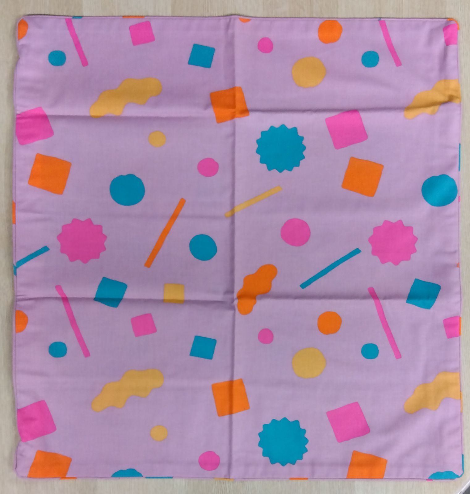 くすんだピンク色にポップな形と色のデザインが散りばめられた座布団カバーです。