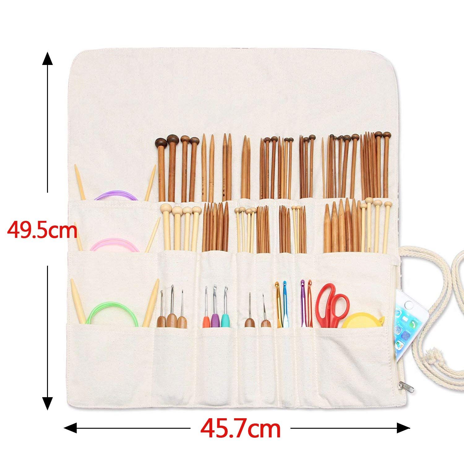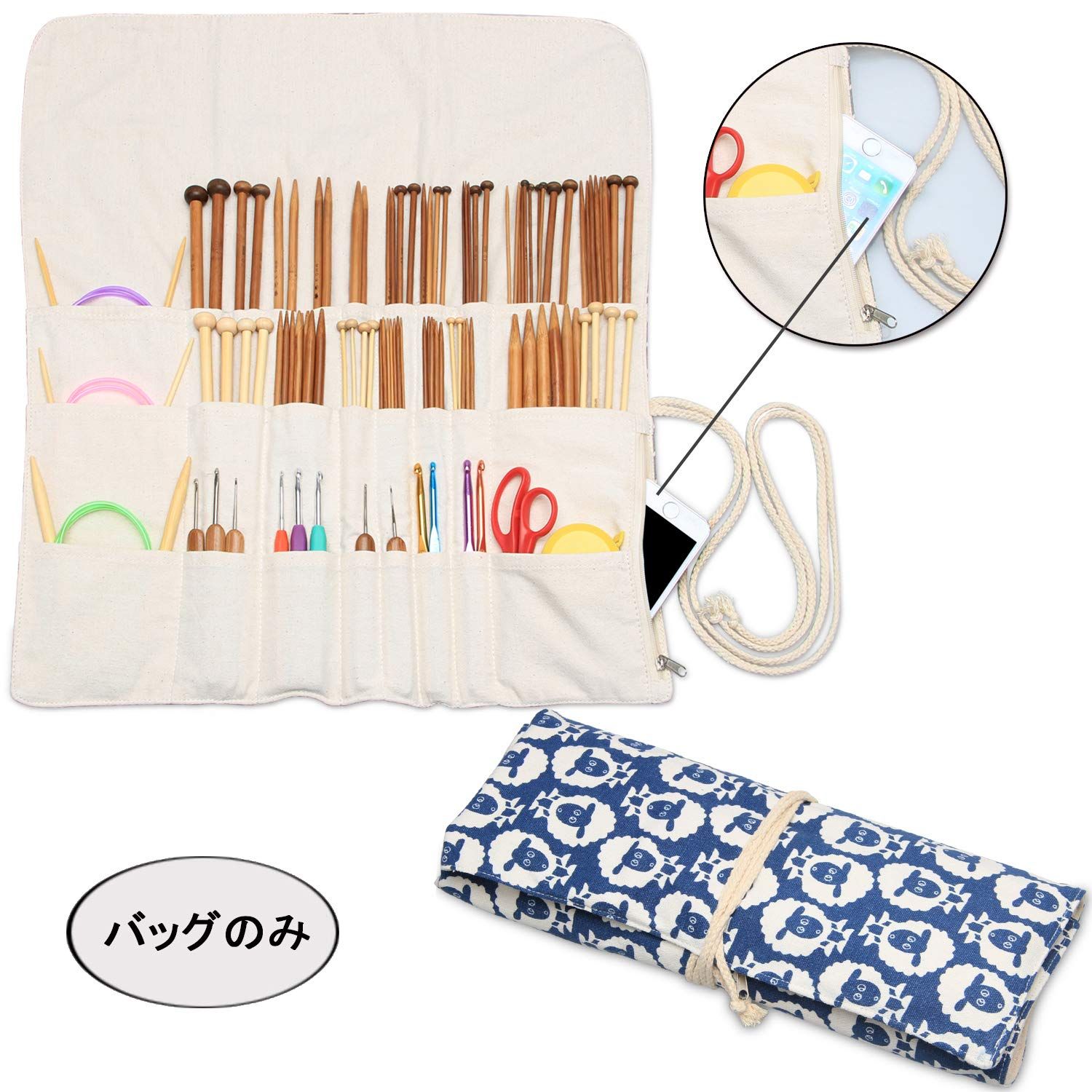 大容量:異なる深さと幅の差込口にはかぎ針・レース針・輪針・棒針(最大36CM)・編み物アクセサリーを収納できます。ファスナーポケットは小物の収納に便利です。
