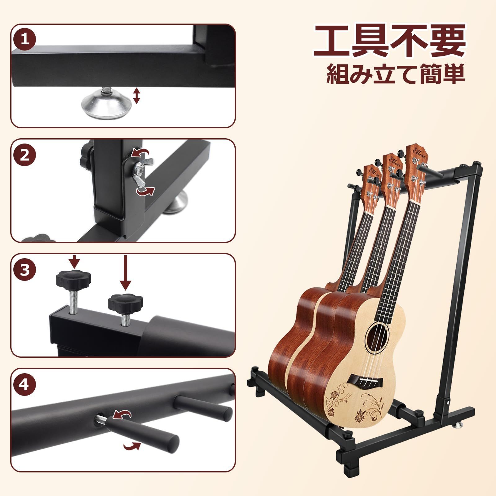 【組み立て簡単】より安心な輸送と保管をするために解体式のデザインで、簡単な組み立てで利用できます。誰でもどこでも簡単に組み立てができるので、解体して持ち運んで再度組み立てもすぐにできます。旅行するミュージシャンにとって非常にコンパクトで、便利なアイテムです。シンプルなデザインで工具がいなくても楽々な組み立てが出来ます。便利な折りたたみタイプのギタースタンド。使わないときも省スペースですっきり収納できます。