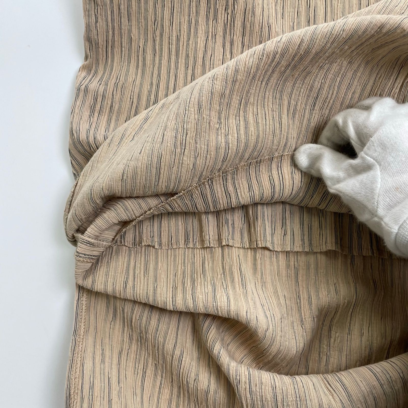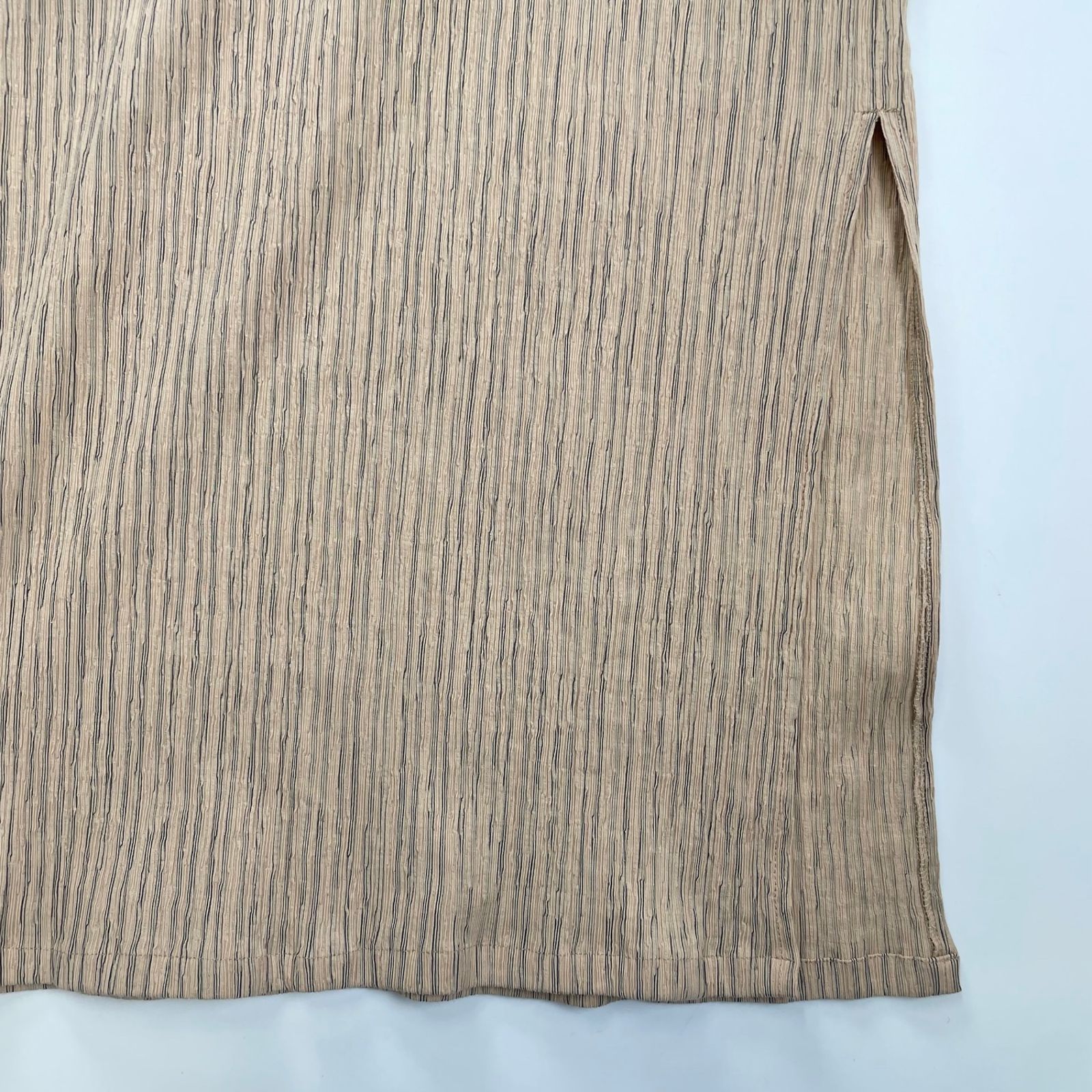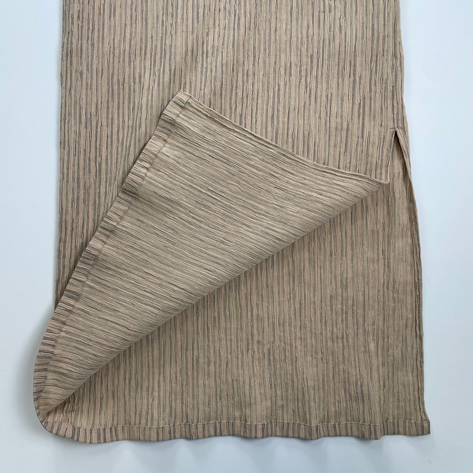 細かくギャザーを取ったような凹凸のある素材をベースに作られたIラインのワンピースで、抜け感のあるナチュラルな風合いが特徴。