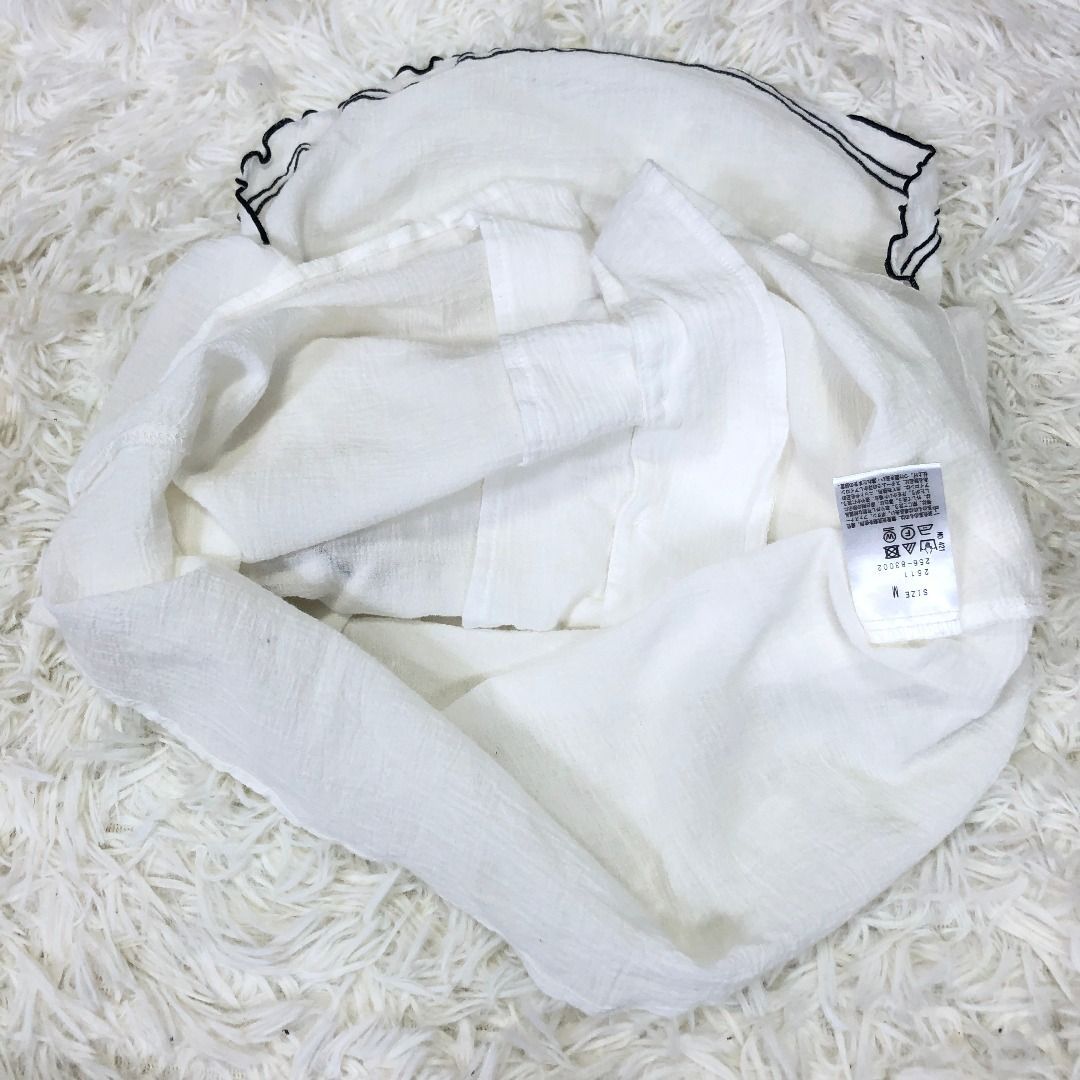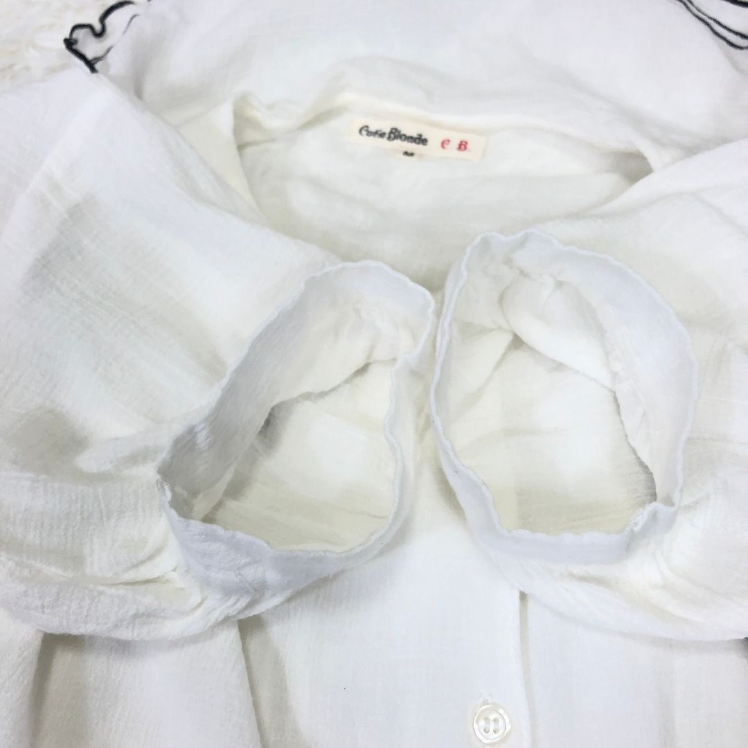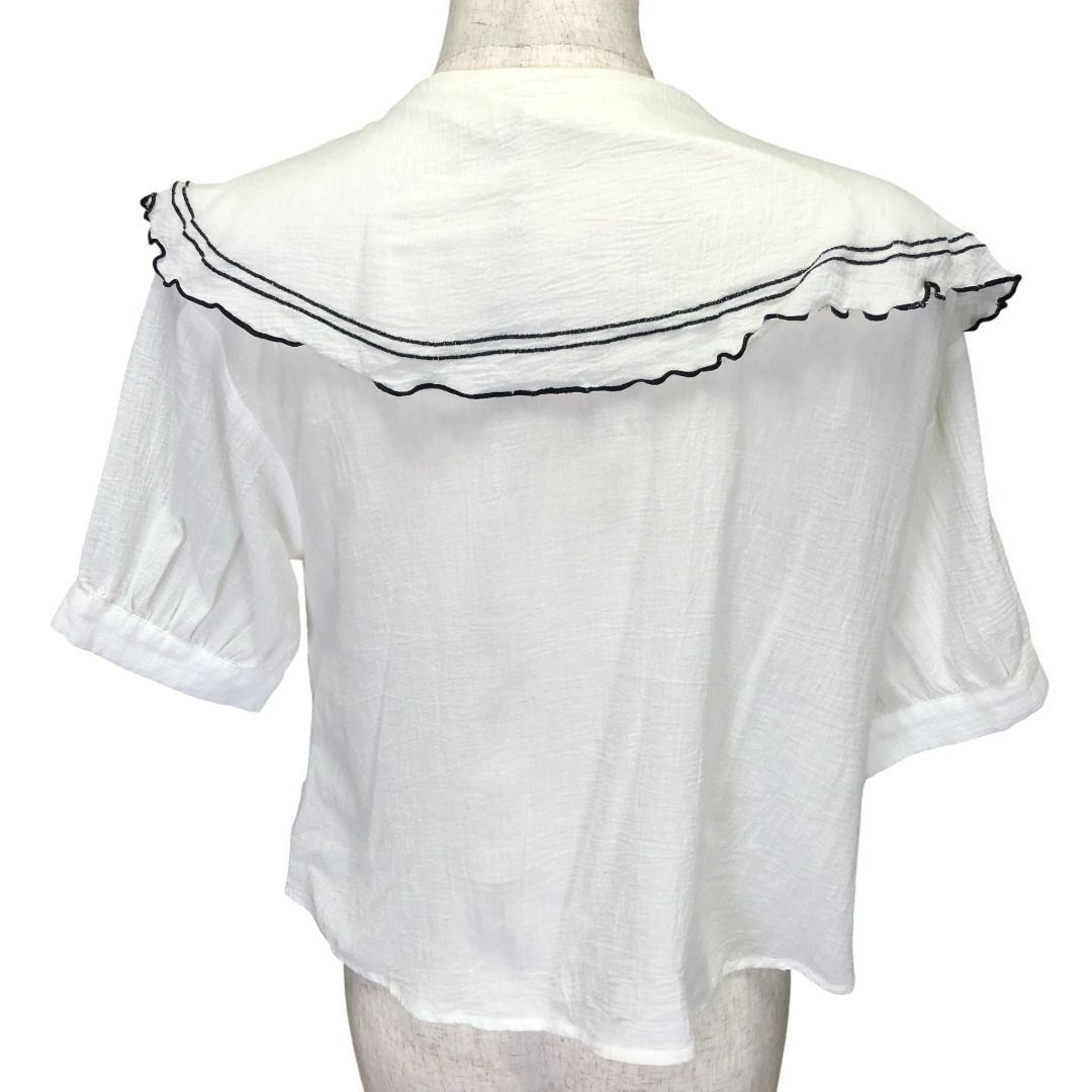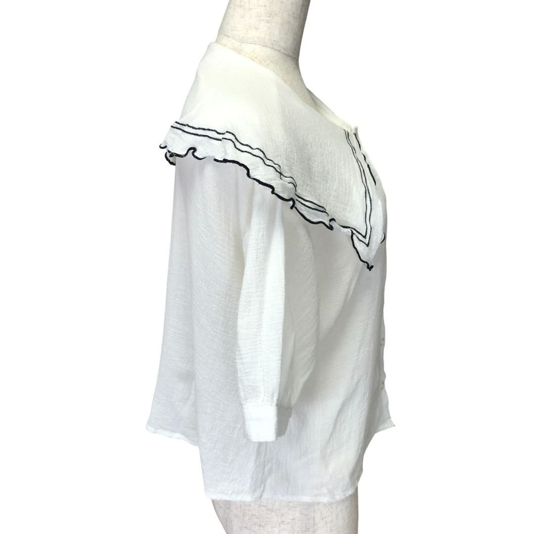 大きなフリル付きの襟に黒い縁取りが施されています。生地は薄手で、ややシワ感のある素材です。袖口はギャザーが入っています。前ボタン着脱。春夏用です。透け感があります。