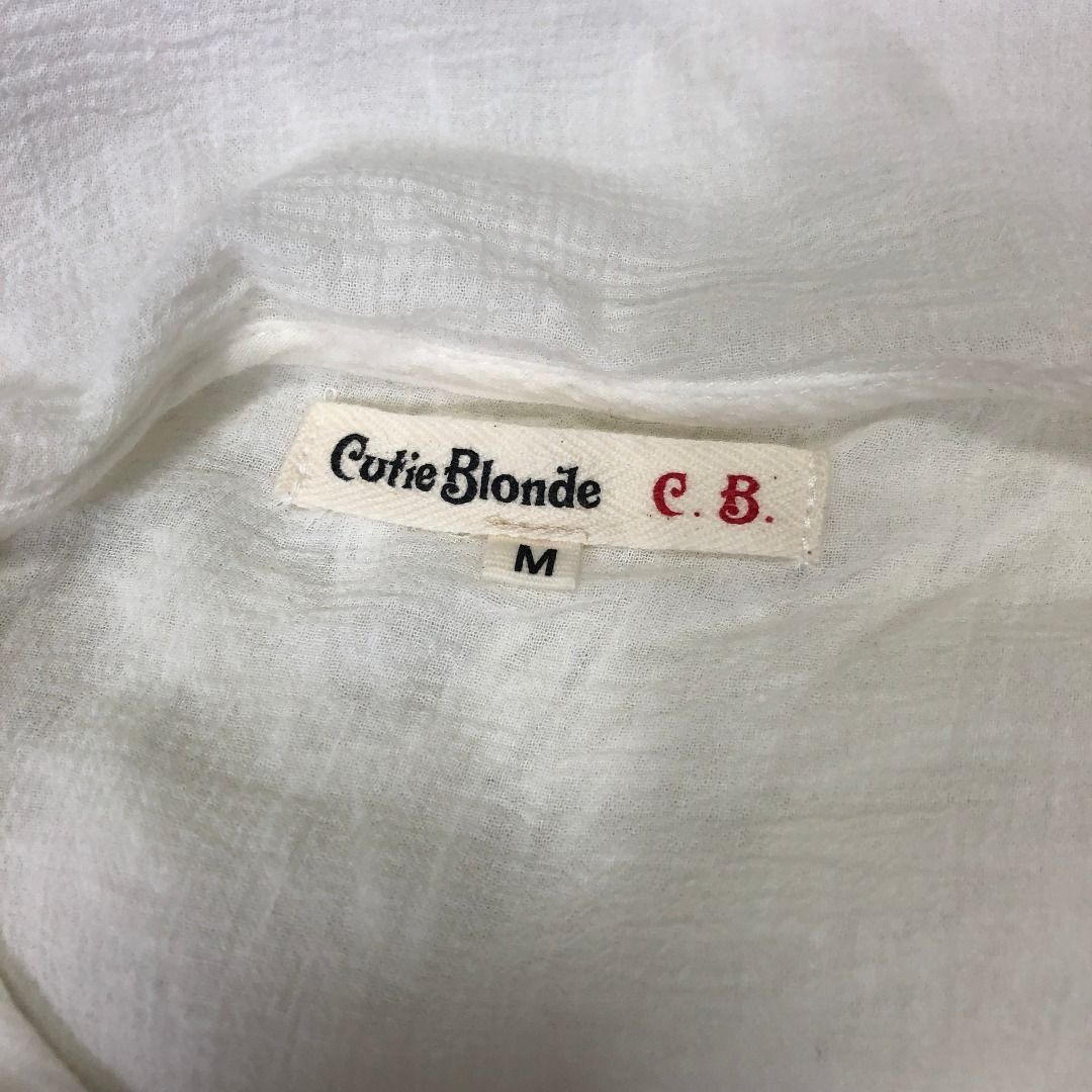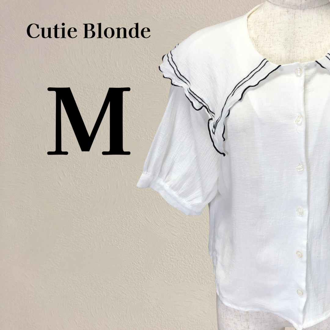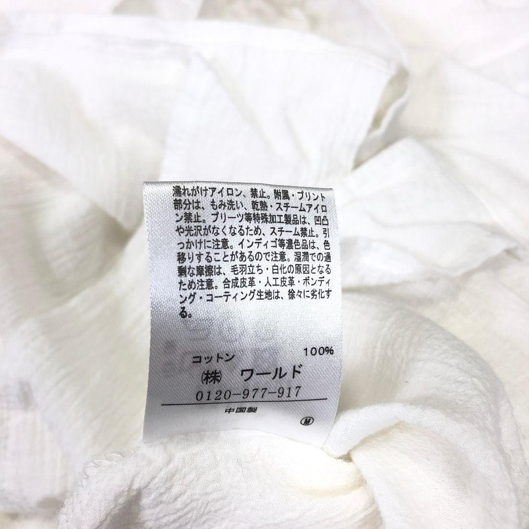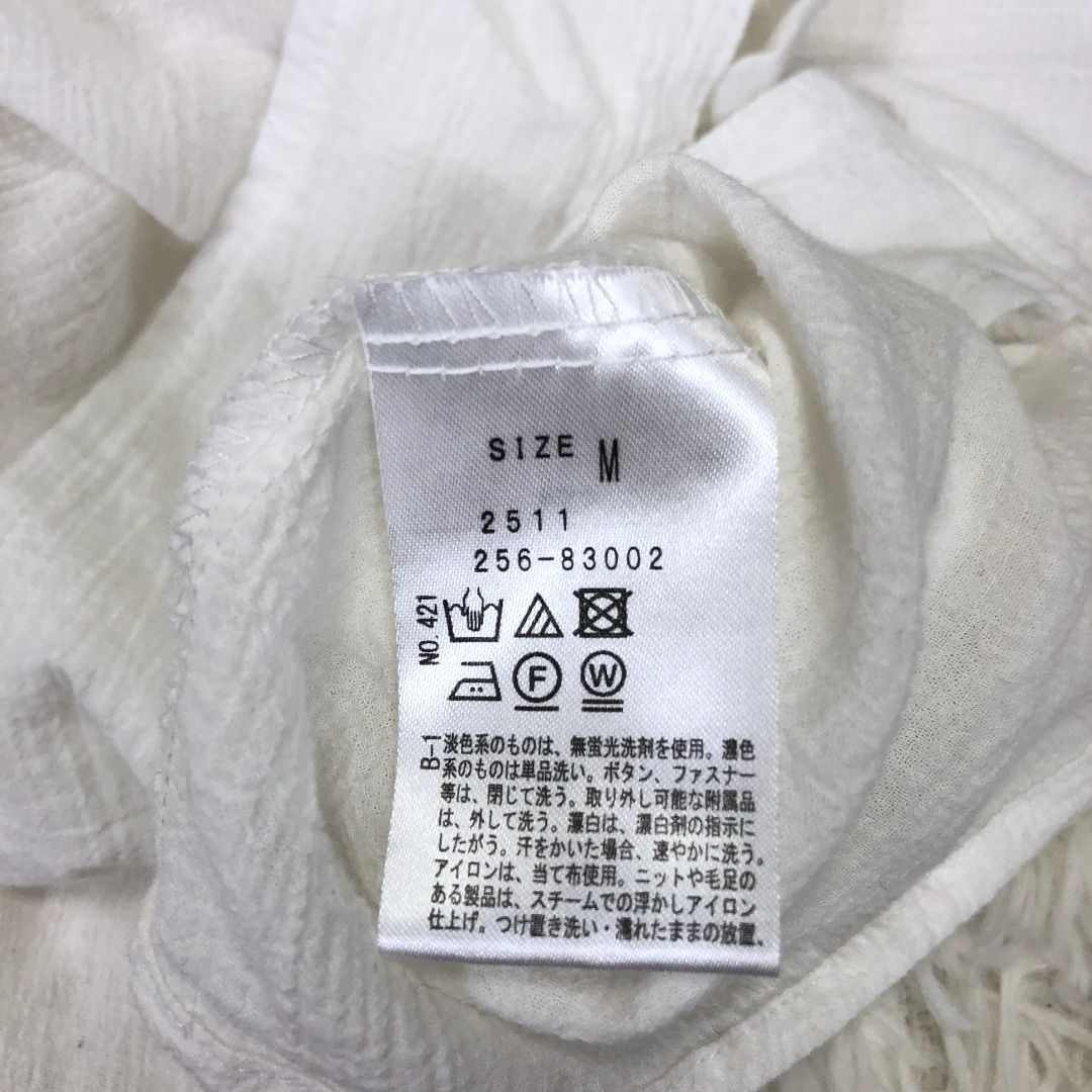 大きなフリル付きの襟に黒い縁取りが施されています。生地は薄手で、ややシワ感のある素材です。袖口はギャザーが入っています。前ボタン着脱。春夏用です。透け感があります。
