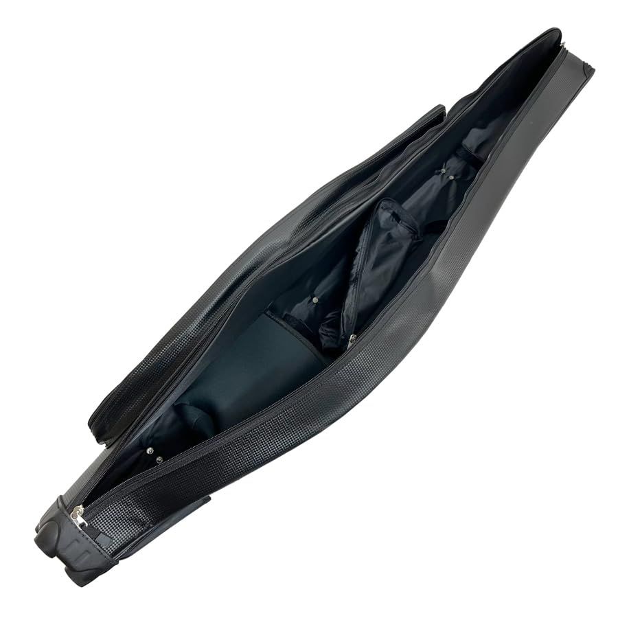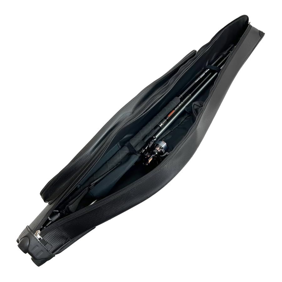 傷や衝撃から竿を守るセミハードタイプリールインロッドケース。耐久性に優れたYKK大型ファスナー採用。水や汚れに強い素材でメンテナンスも簡単です。外側にピトン固定システム採用。