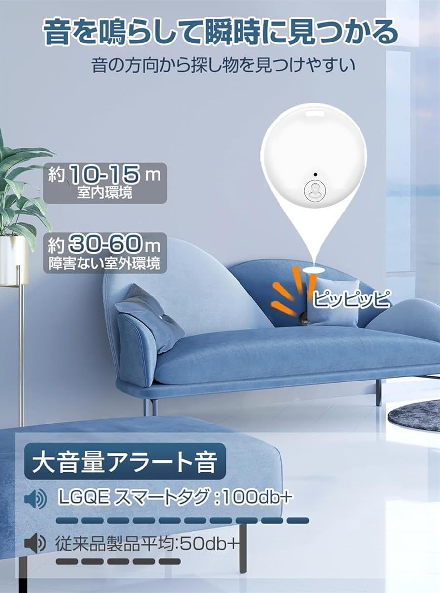 【音を鳴らして置忘れ物を発見】:スマートタグはブザーを鳴らす機能を搭載しており、紛失時にはアプリから音を鳴らして素早く見つけ出すことができます。もう二度と紛失に悩む必要はありません。布団の底やソファの隙間に落としてしまった場合でも、大音量で位置を確認可能です。