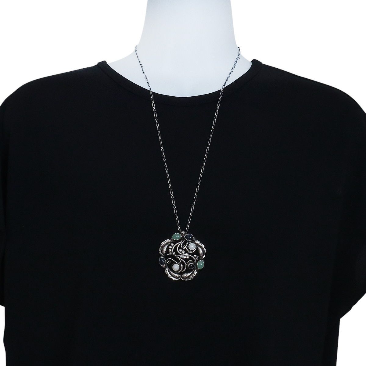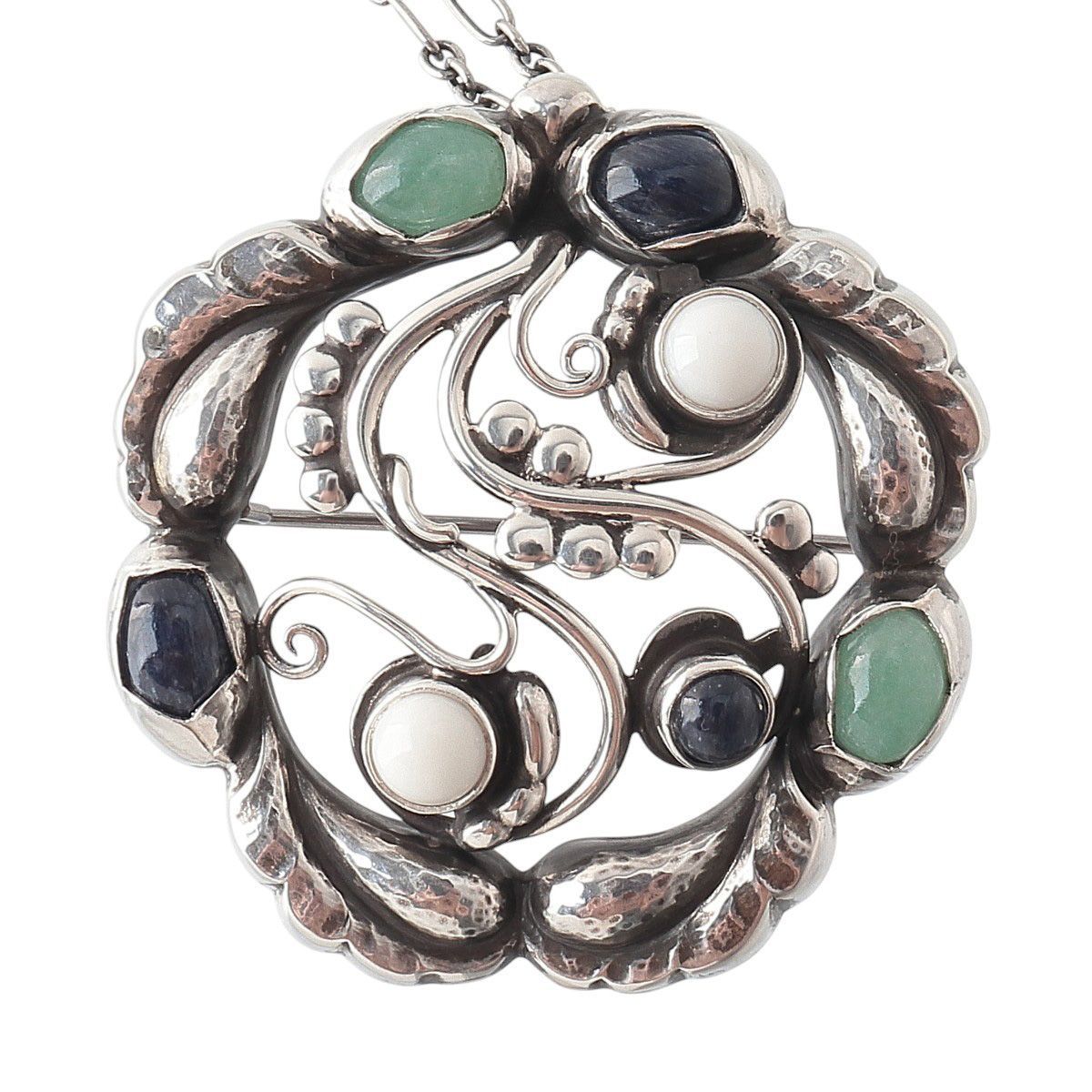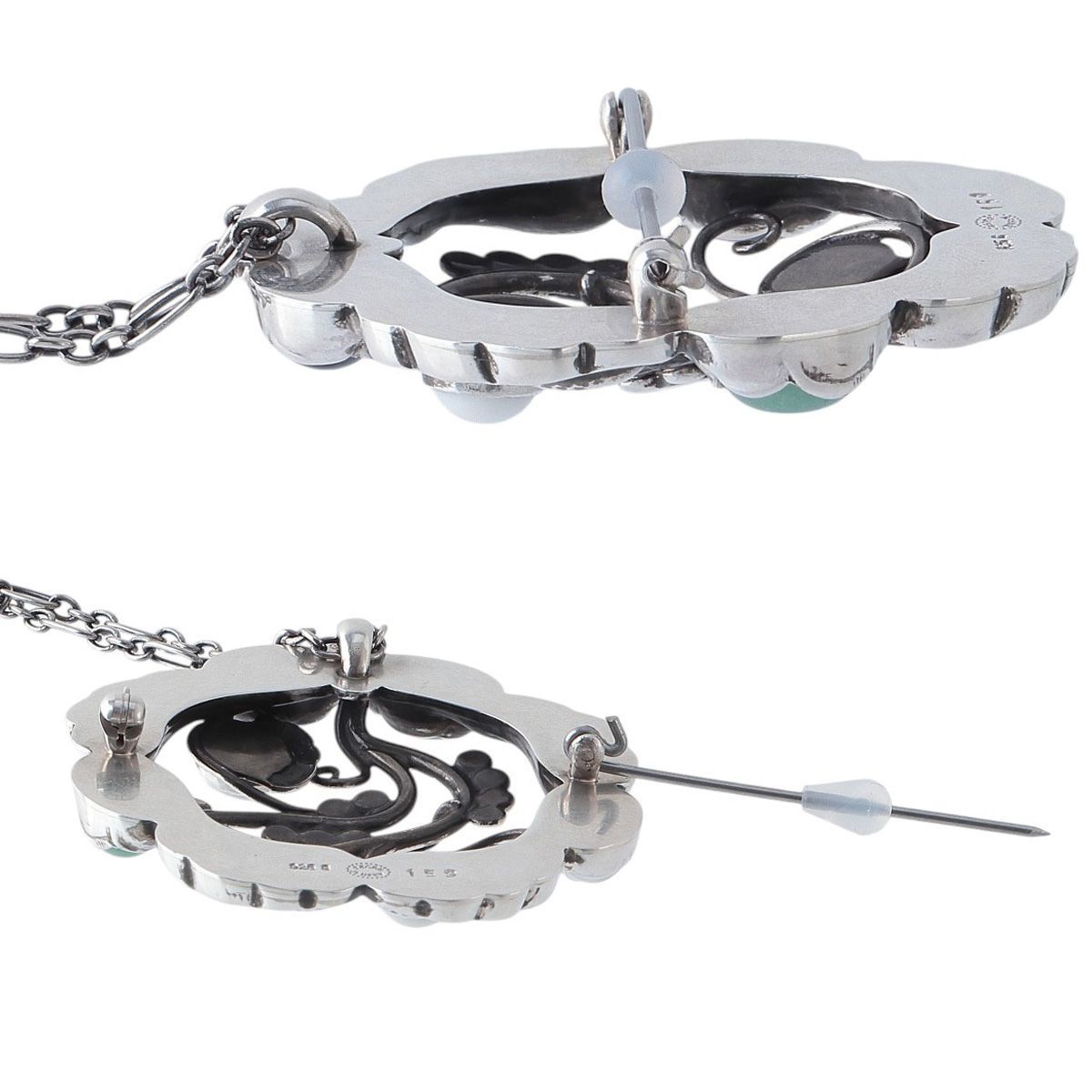 【商品状態】ジョージジェンセンの#159のネックレスです。ペンダントはブローチ兼用になります。色石はアメジストとガーネットかと思われます。シルバー特有の黒ずみと細かいキズ、カラーストーンにわずかなカケがありますが、比較的綺麗な状態です。