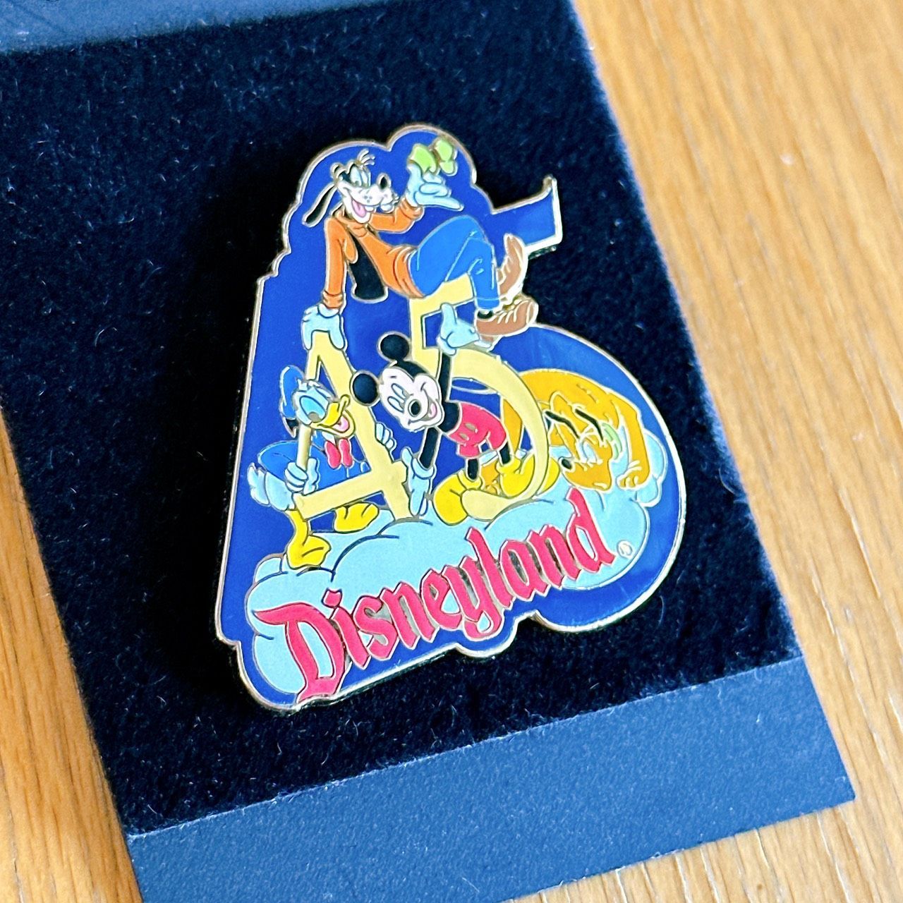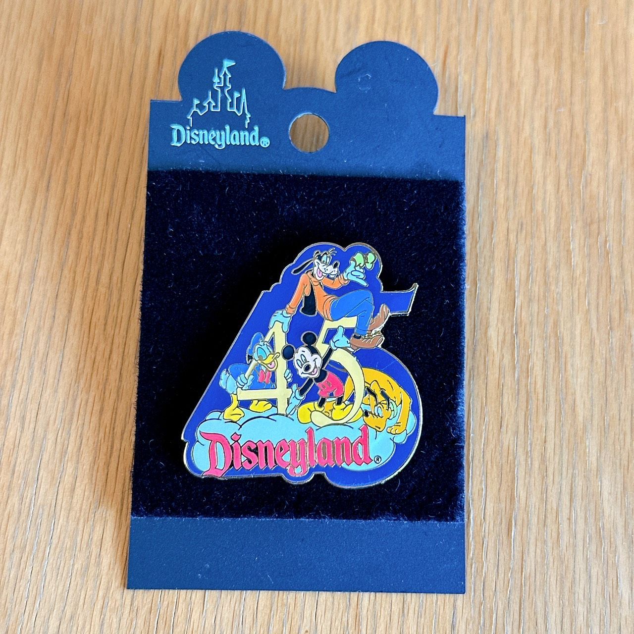 ミッキー・グーフィー・ドナルド・プルートが描かれた、45 Years of Magicのピンバッジ(台紙付き)です。