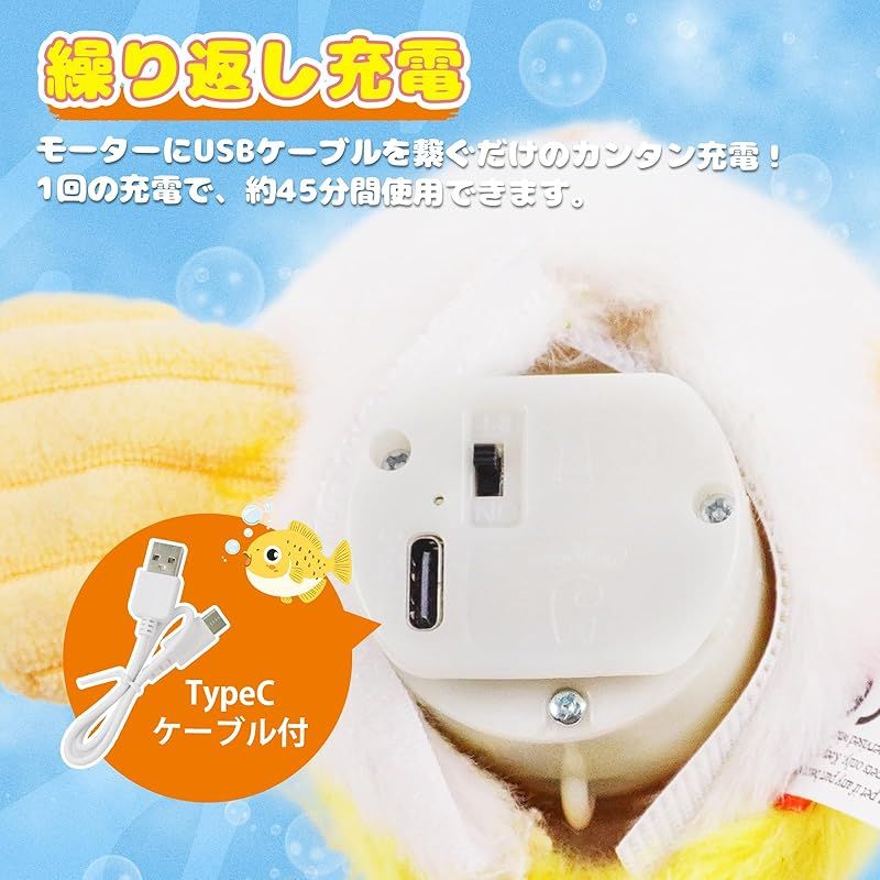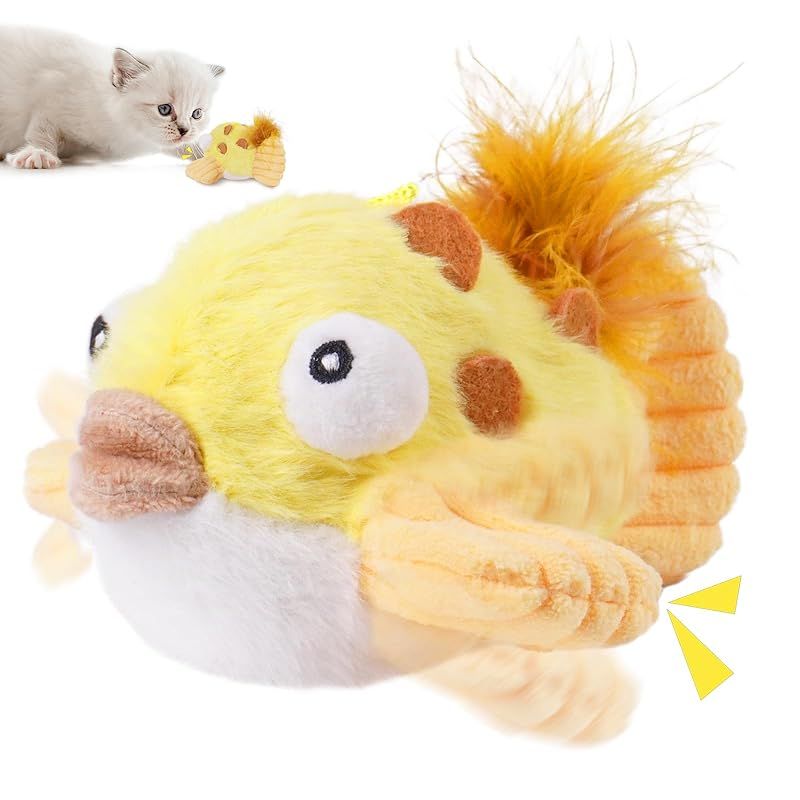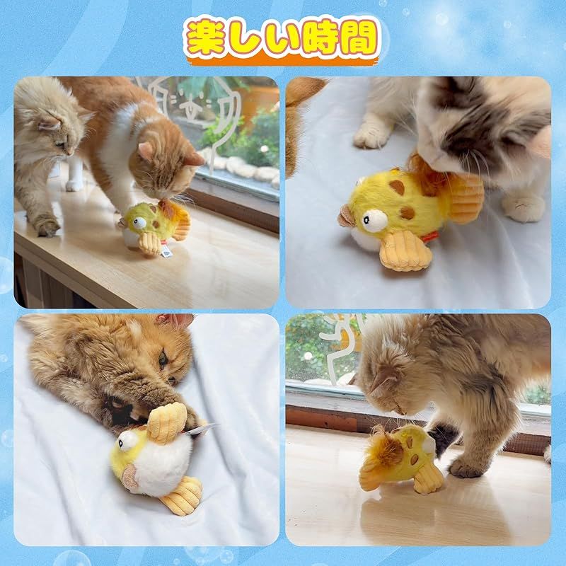 "まるで本物の魚のように動く、黄色いハリセンボン型の猫用けりぐるみ。猫が軽く叩くと本体が振動し、毎回異な速さで再始動!スピード、リズム、ゆっくりの3モードが自動で切り替わり、猫の興味を長く引きつけます。内部にはカシャカシャ素材も搭載しており、振動と音で五感を刺激します。 動作は約15秒間。停止後は猫が再び叩くまで自動で待機状態となり、余計な電力を使いません。夜間の一人遊びでも静かで、飼い主さんも安心です。 内蔵のモーターは簡単に取り外し可能。ぬいぐるみ部分は丸洗いでき、いつでも清潔。USB Type-C充電式で、約45分間の連続使用が可能。猫ちゃんが飽きずに長時間遊べます。"