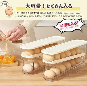 大容量で安心 1ケースに12~14個の卵を収納可能。一般的なパック卵もそのまま入るので、卵をよく使うご家庭に最適です。