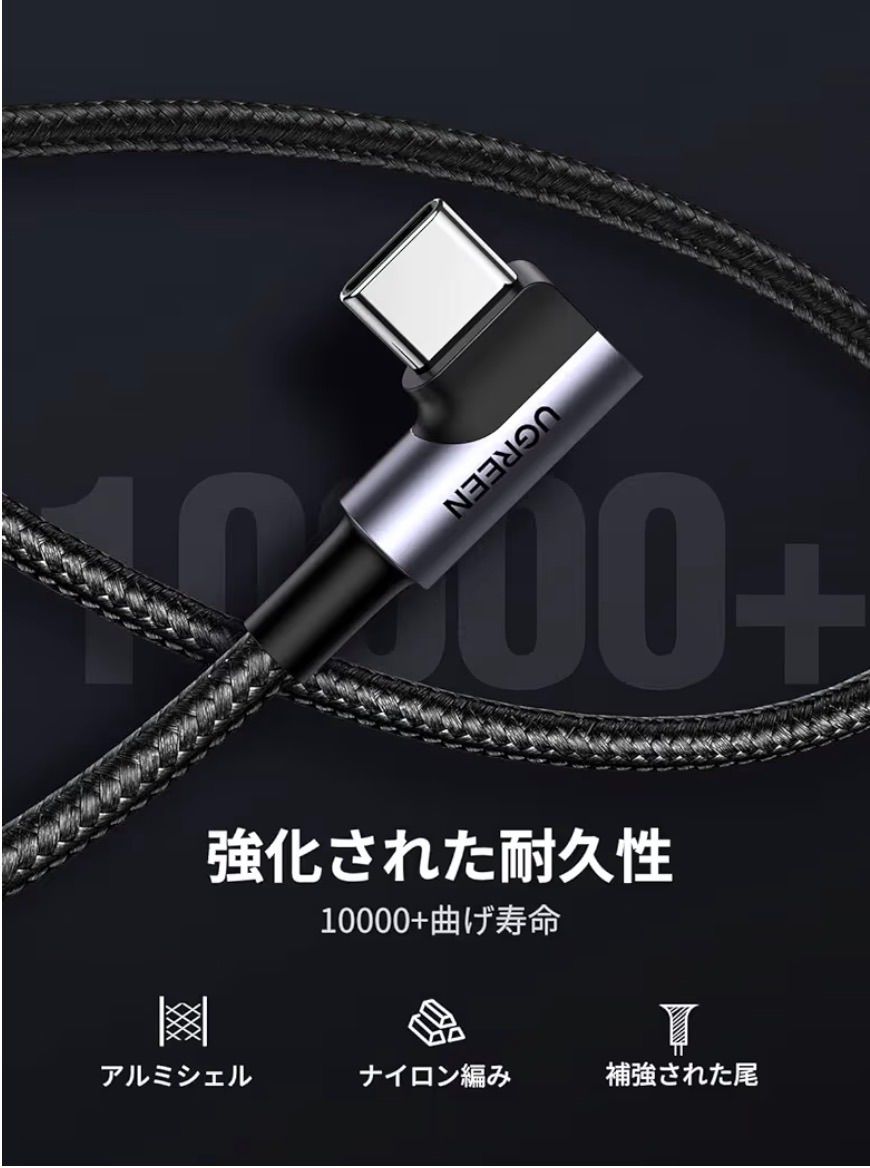 高耐久なナイロンファイバー被覆と多重シールド構造で日常利用の摩耗を防ぎながらコードに柔軟性を持たせ、絡みにくくて、10000回以上の折り曲げテストでも断線しません。