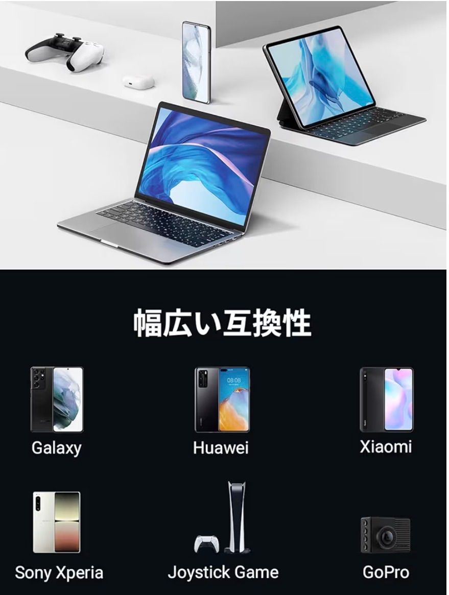 Xperia XZ/XZ1/XZ2、Honor 8/Nova 2、Galaxy S9/S8/S8 Plus、HTC U11/10、Asus Zenfone 3、LG G5/G6/V30/V20、Nexus 5X/6P、、Gopro Hero 6など様々なモバイルデバイスに対応可能なUSB Cケーブです。