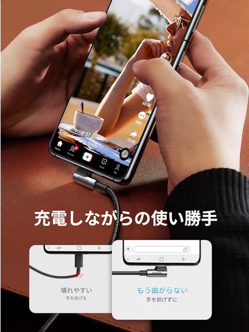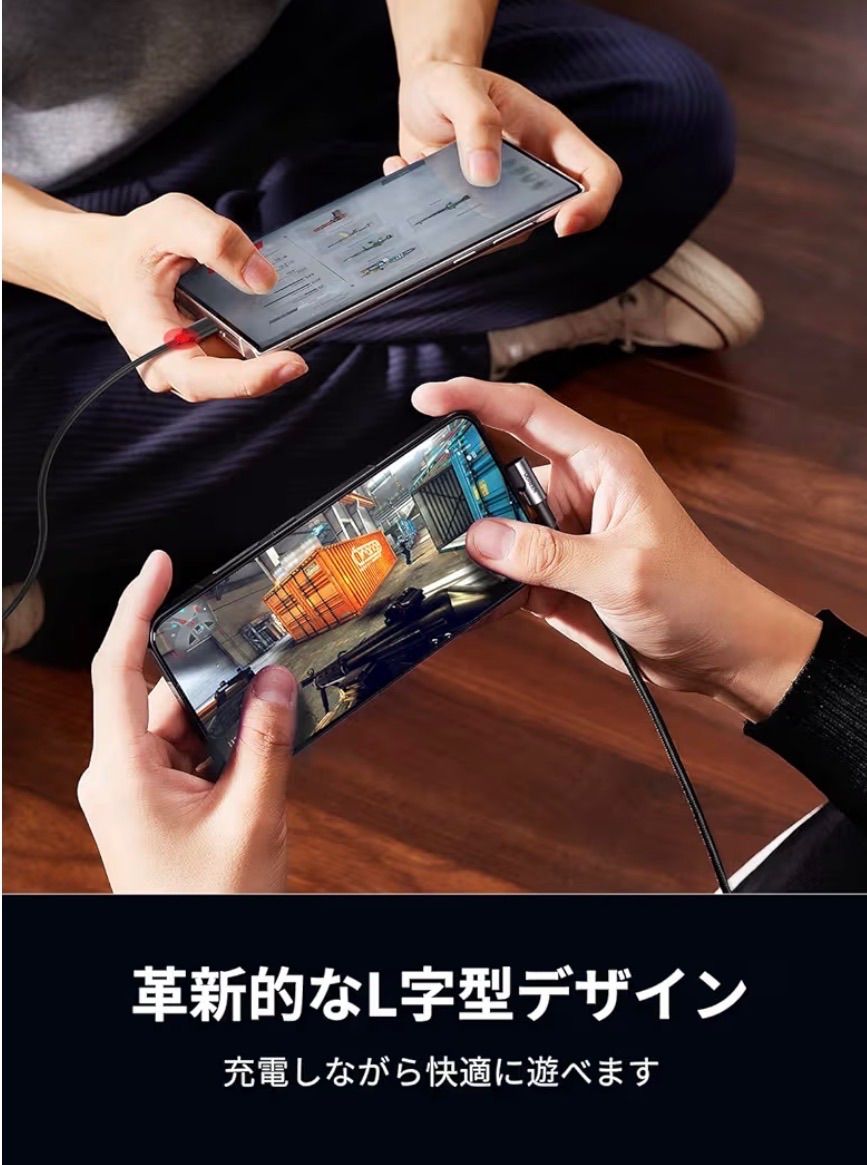 USB CコネクタがL型デザインを採用したので、充電しながらゲームをしたり、動画を見たりする際、コネクタの接続部分が邪魔にならず、快適に楽しむことができます。また、過度に曲げることで断線や脱線を防ぎます。