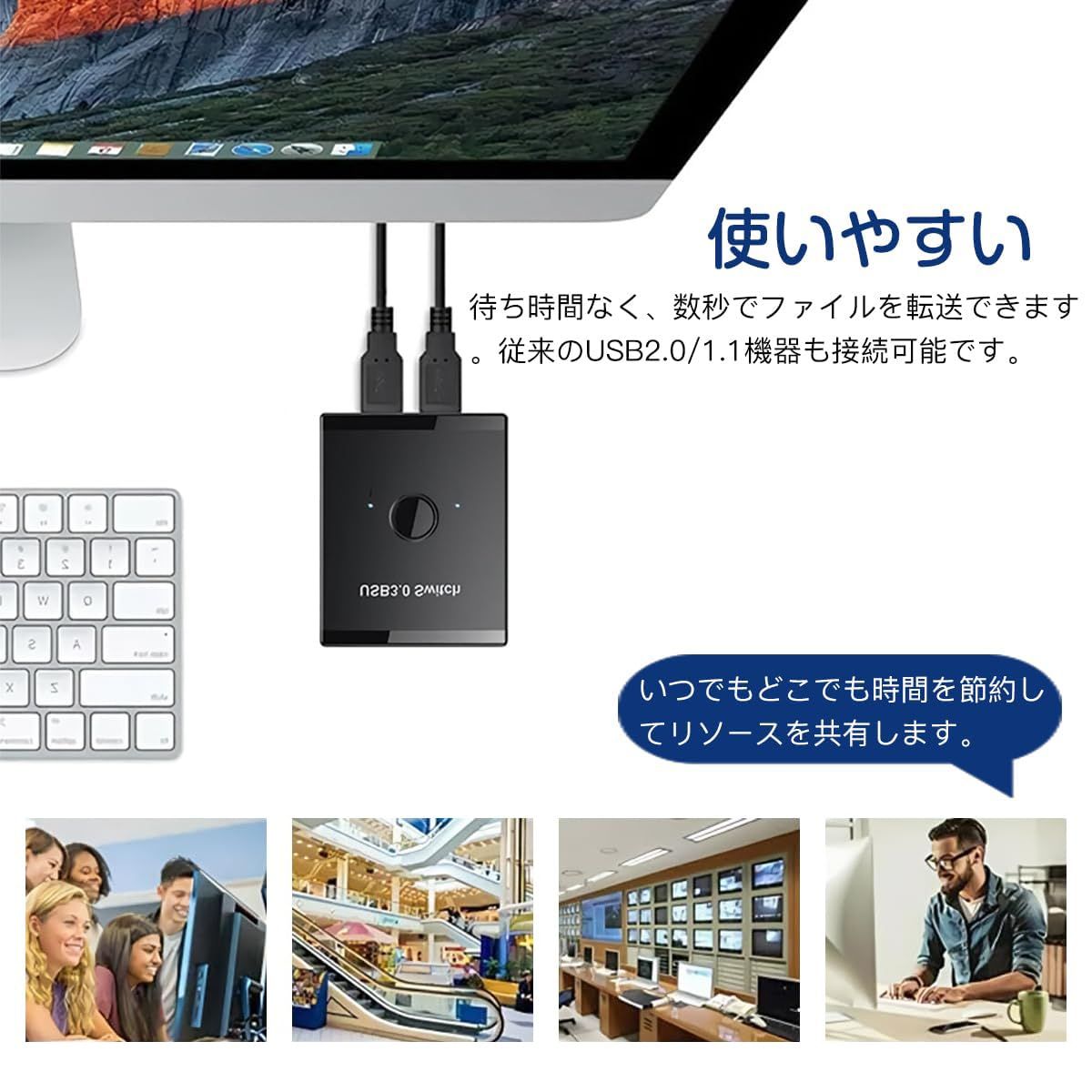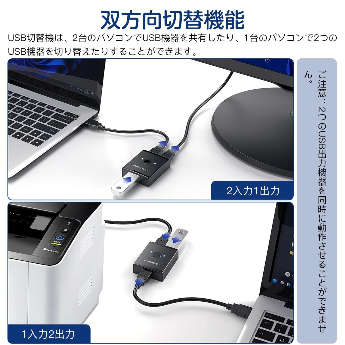 USB切り替え機PC2台用:USB切替機は、プリンタ、マウス、キーボード、外付けハードディスク、ハブなどのUSB 3.0ポートを2台のパソコンで共有したり、1台のパソコンで2つのUSB機器を切り替えたりすることができます。※USB3.0ケーブルは付属していません。2つのUSB出力機器を同時に動作させることができません。