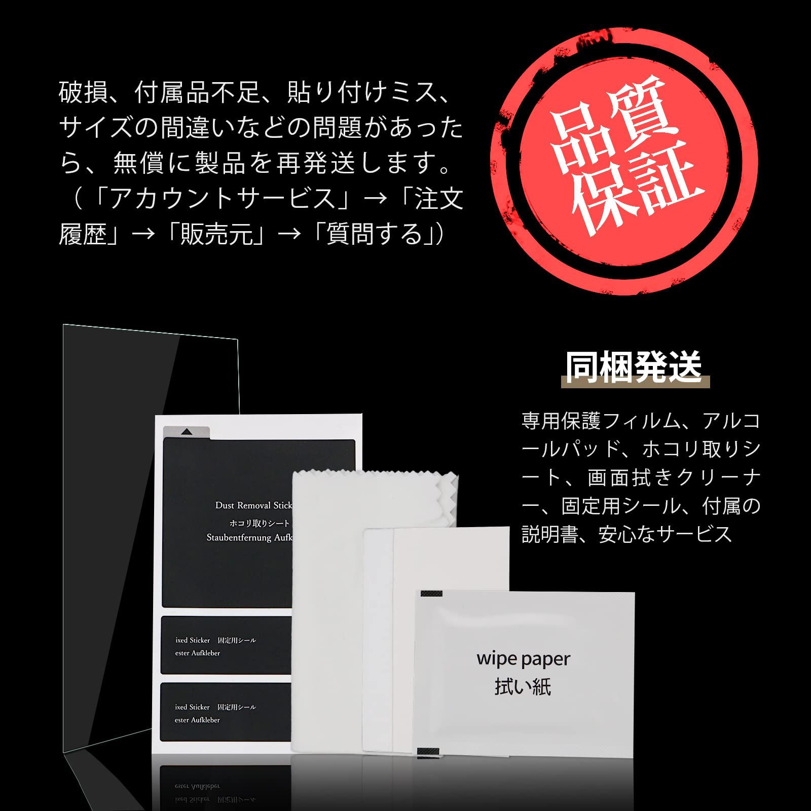 【同梱発送】専用保護フィルム、アルコールパッド、ホコリ取りシート、画面拭きクリーナー、固定用シール、付属の説明書、安心なサービス
