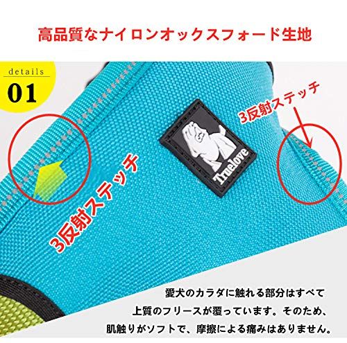 愛犬のカラダに触れる部分はすべて上質のフリースが覆っています。そのため、肌触りがソフトで、摩擦による痛みはありません。カラダに食い込んで不快感を与えないように、ハーネスの幅が広めに作られています。