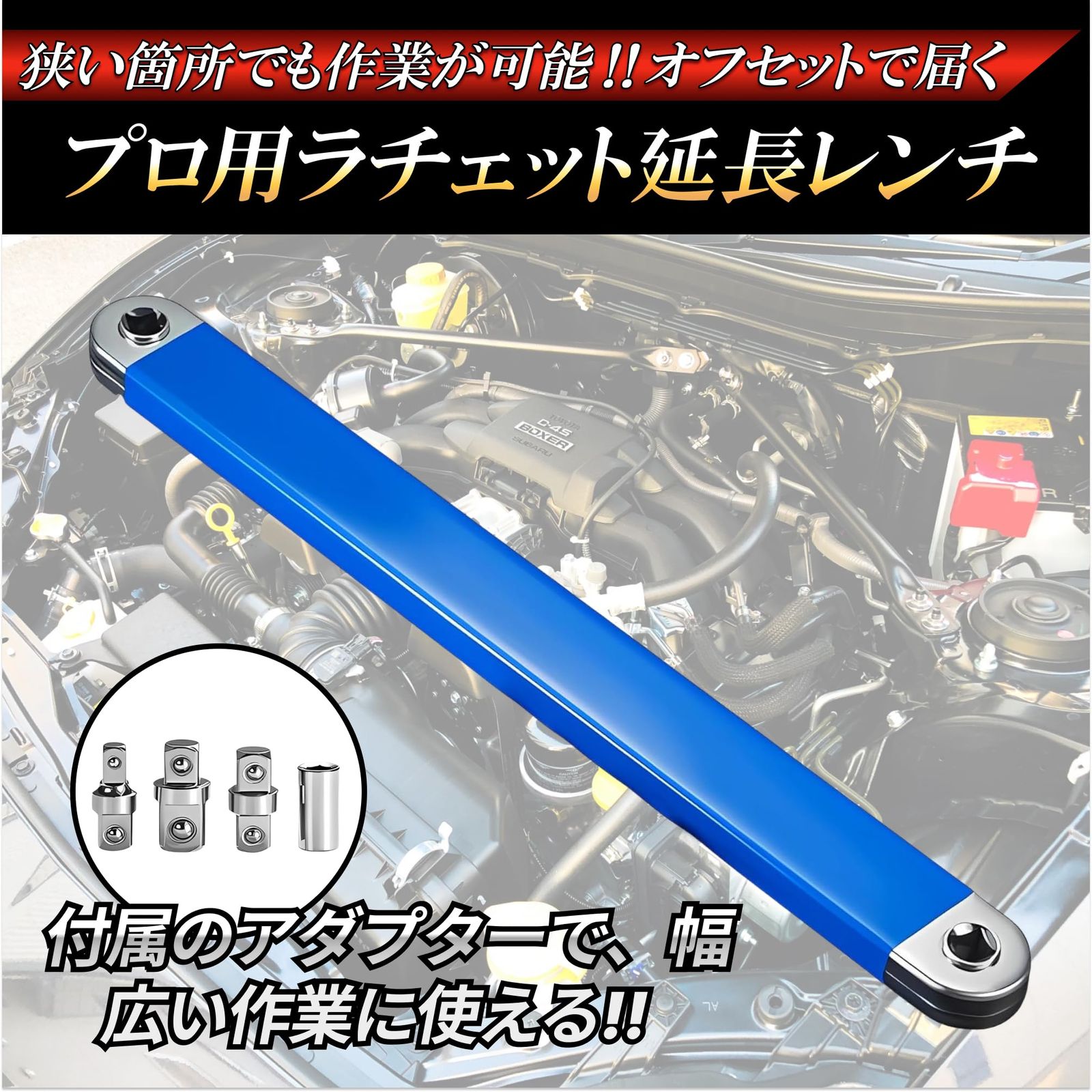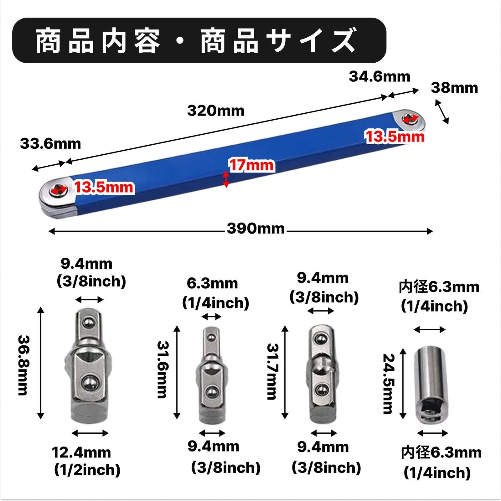 ・セット内容:延長レンチ×1、ビットソケット×1、サイズ変換アダプター×3 ・材質:高炭素鋼 ・全長:約390mm ・中心穴距離:約355mm ・幅:約35mm