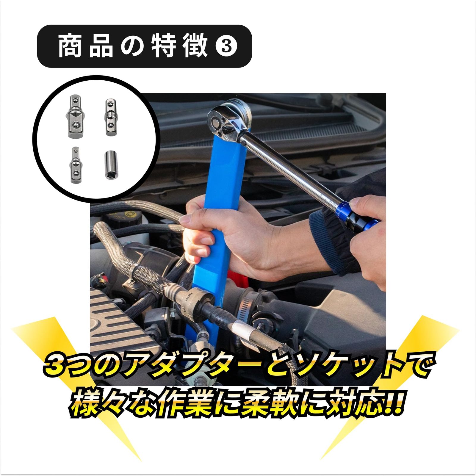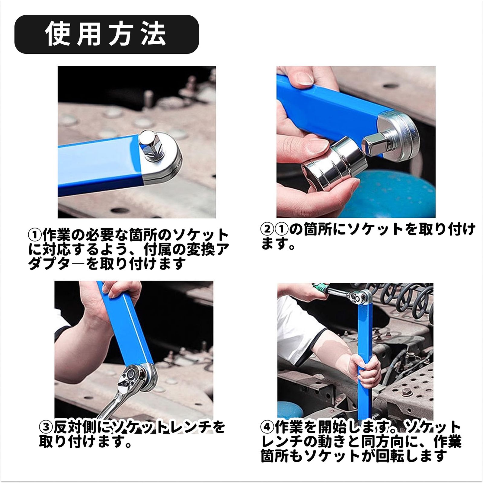 です。自動車やバイクの整備、トラックや機械のメンテナンスなど、手が届きにくい場所でのボルト・ナット作業に最適。耐久性に優れた高炭素鋼素材を採用し、長く安心してご使用いただけます。初心者からプロの整備士まで、幅広いユーザーにおすすめできる多機能ツールです。【商品の特徴1:耐久性と高品質設計】