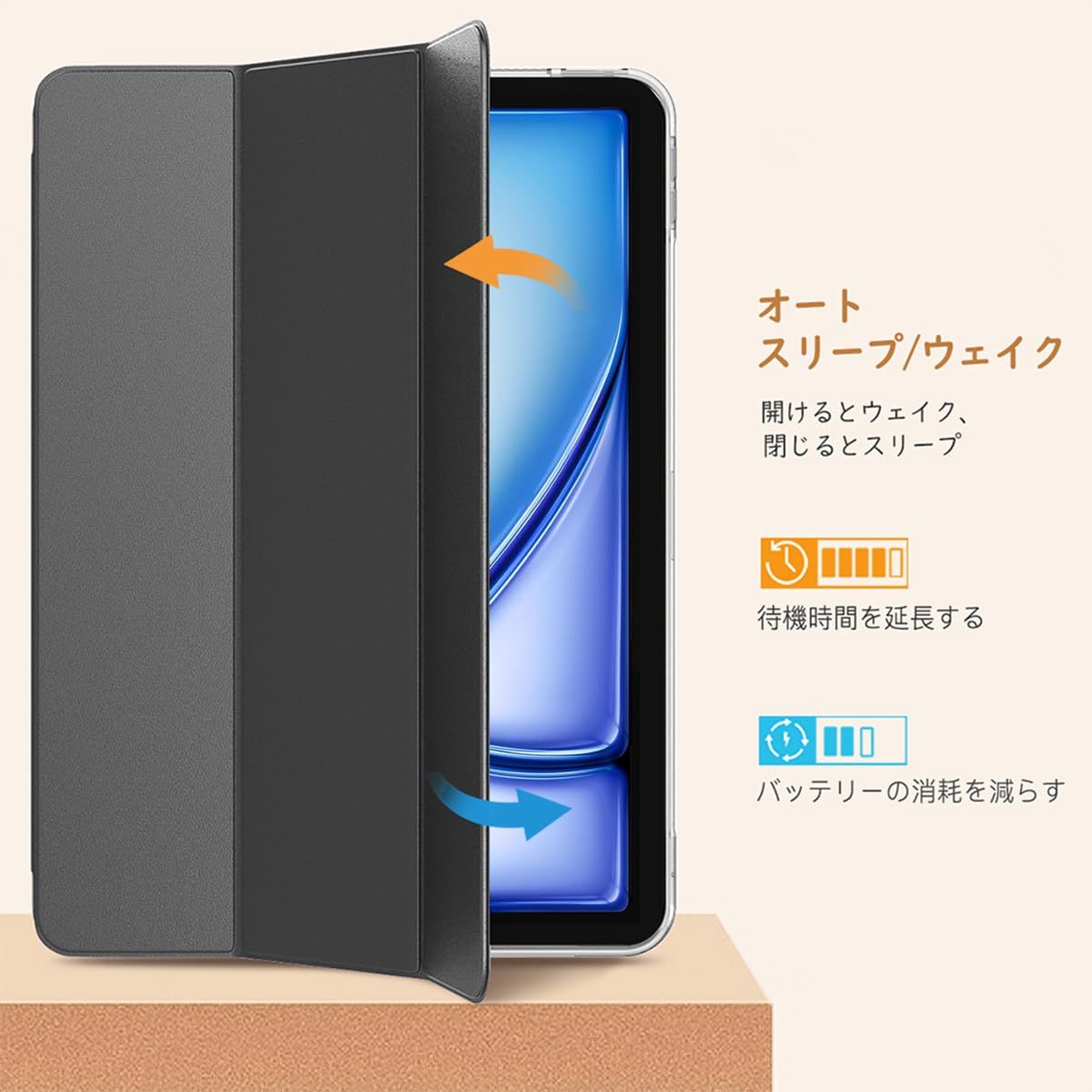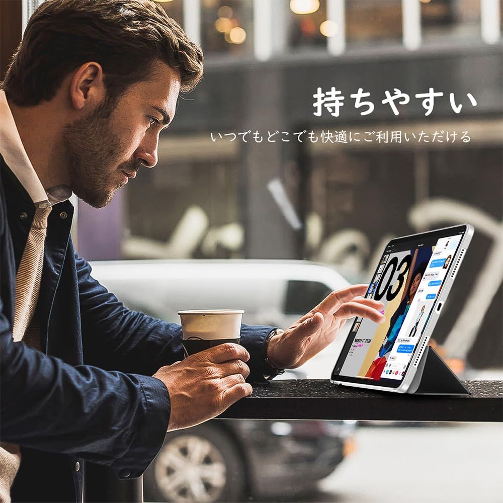 「安定したスタンド機能」 フロントカバーに内蔵された複数のマグネットにより、安定したスタンド機能をご利用いただけます。タイピングや動画視聴などiPadを立ててご使用の際に、とても便利にご利用いただけます。