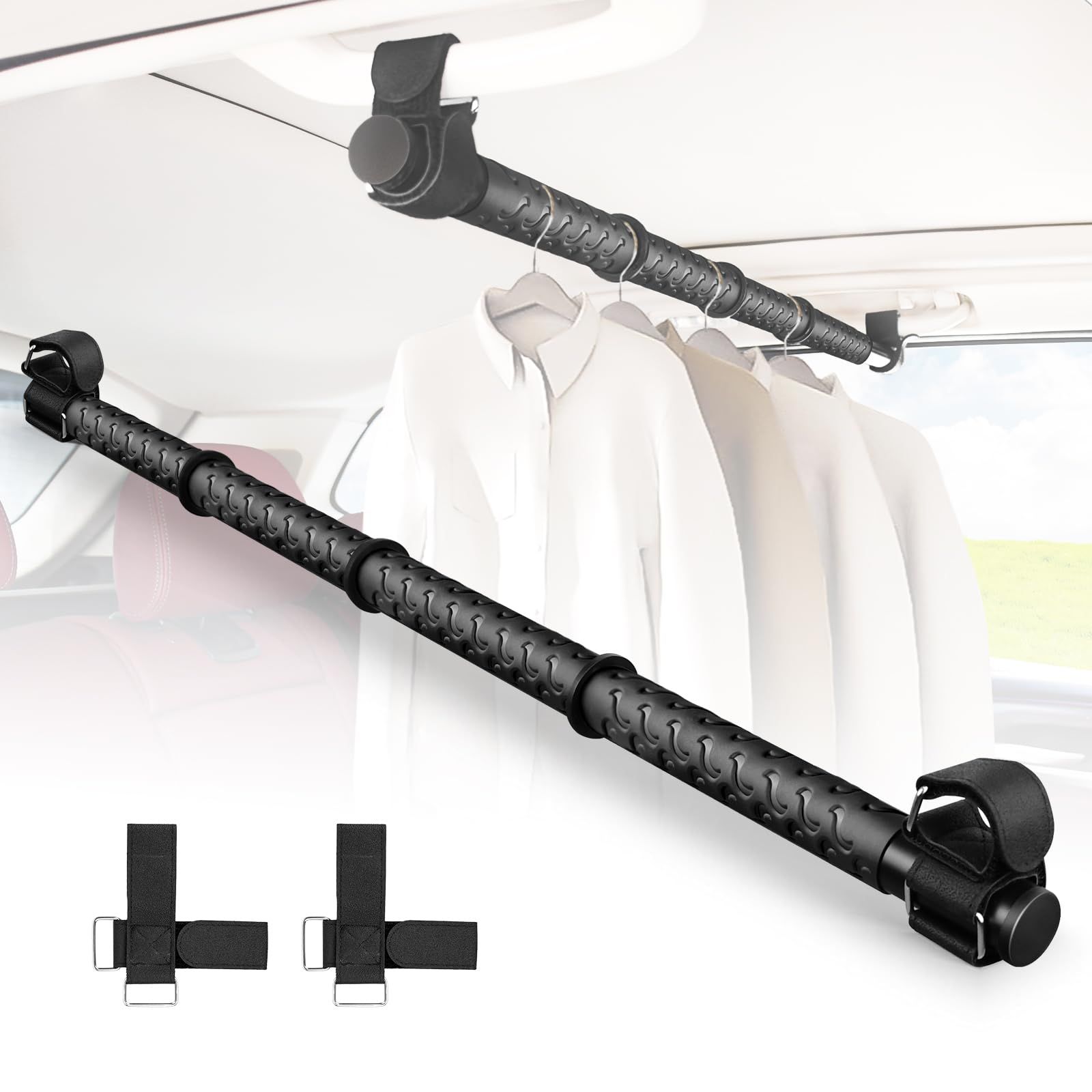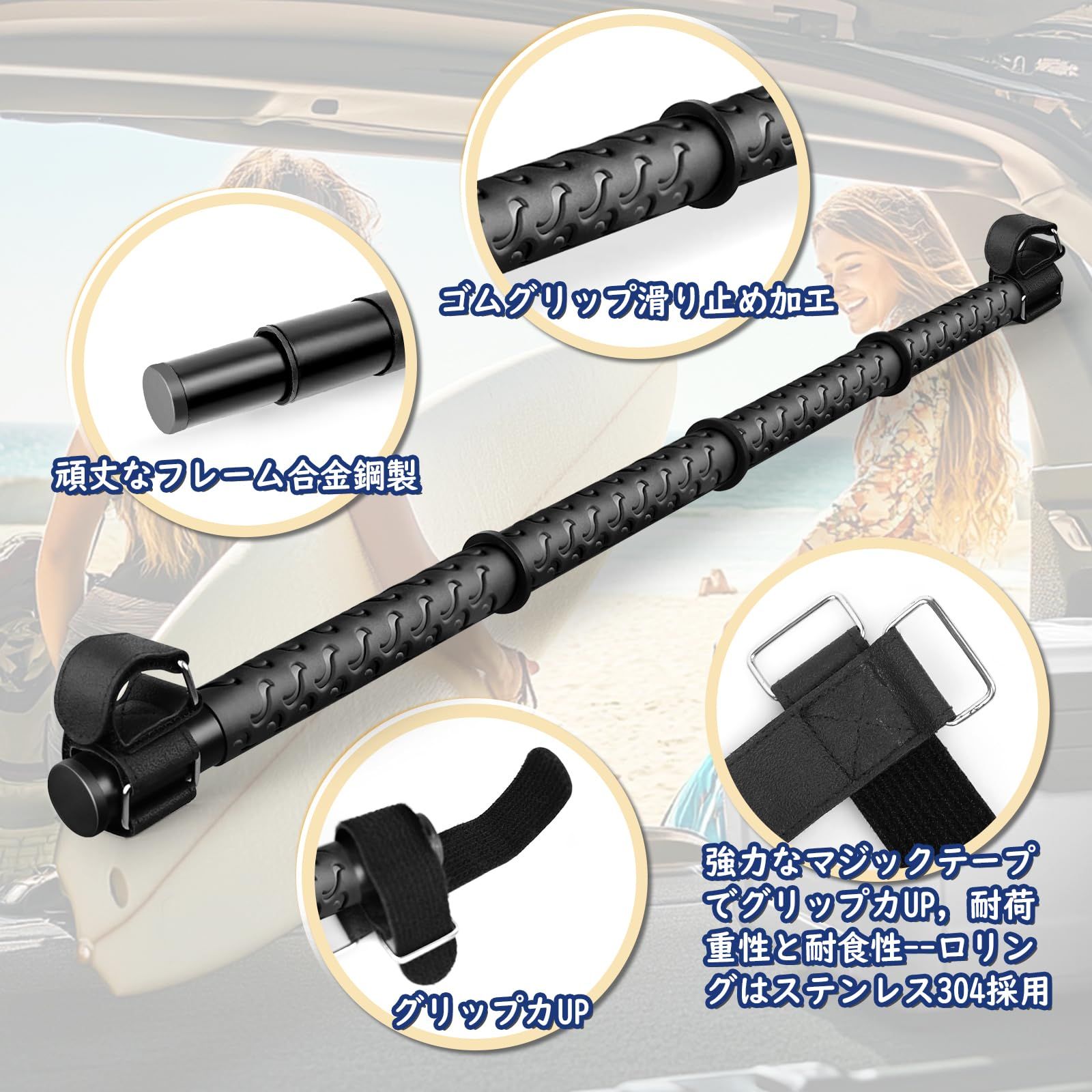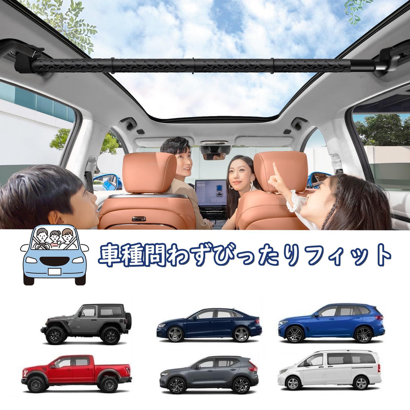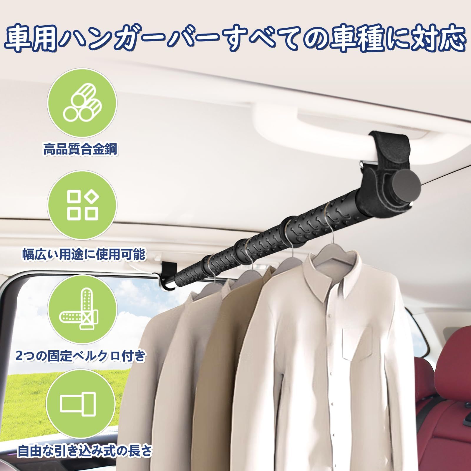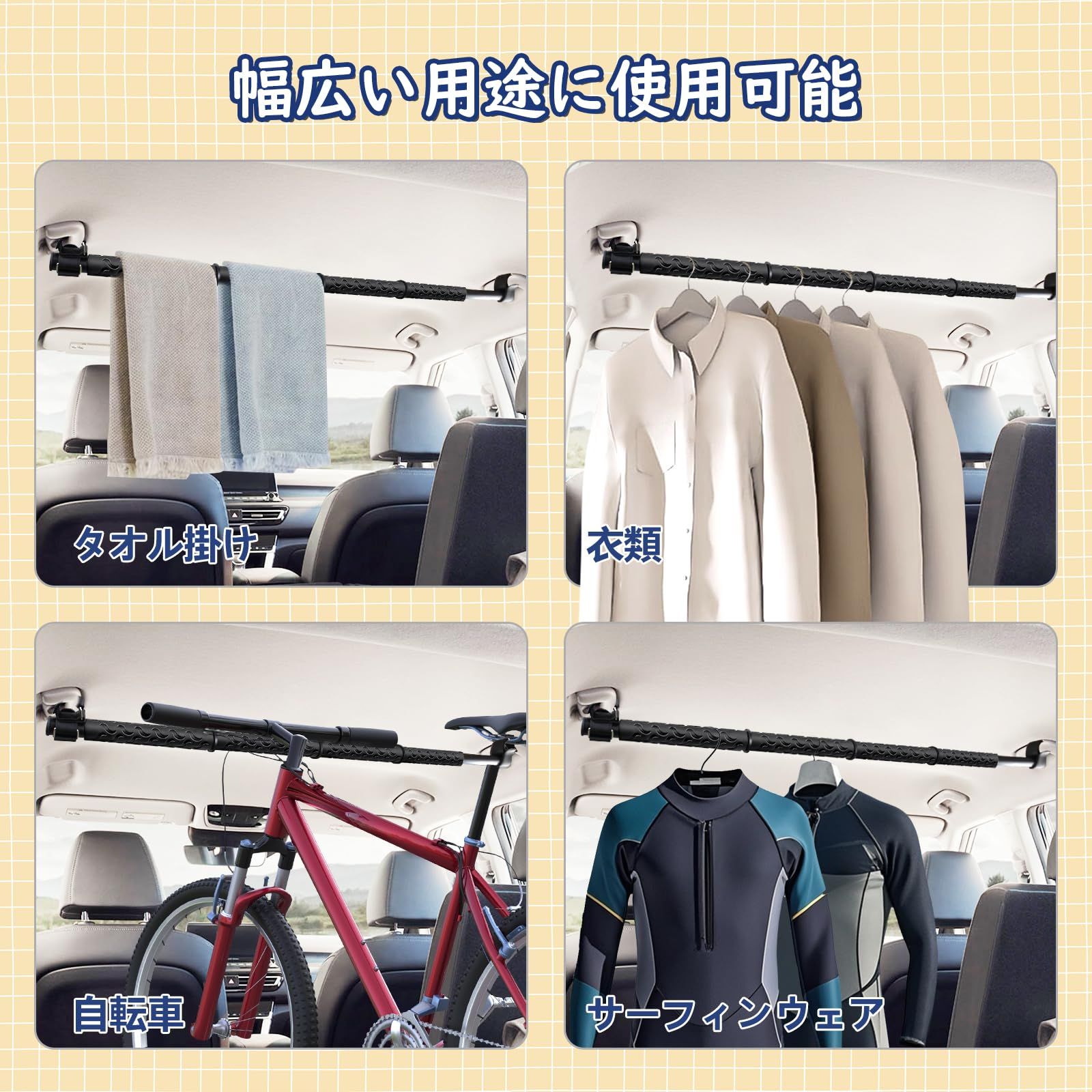 【幅広い用途】マルチグリップバーは、以下のような様々な場面で使用できるTシャツを干したり、濡れたタオルやスーツなどを乾かしたりする物干し竿として使用できます 車内干しの小物や衣類を収納するのに便利です。効率的に収納することで、車内のスペースをより快適に使えます。