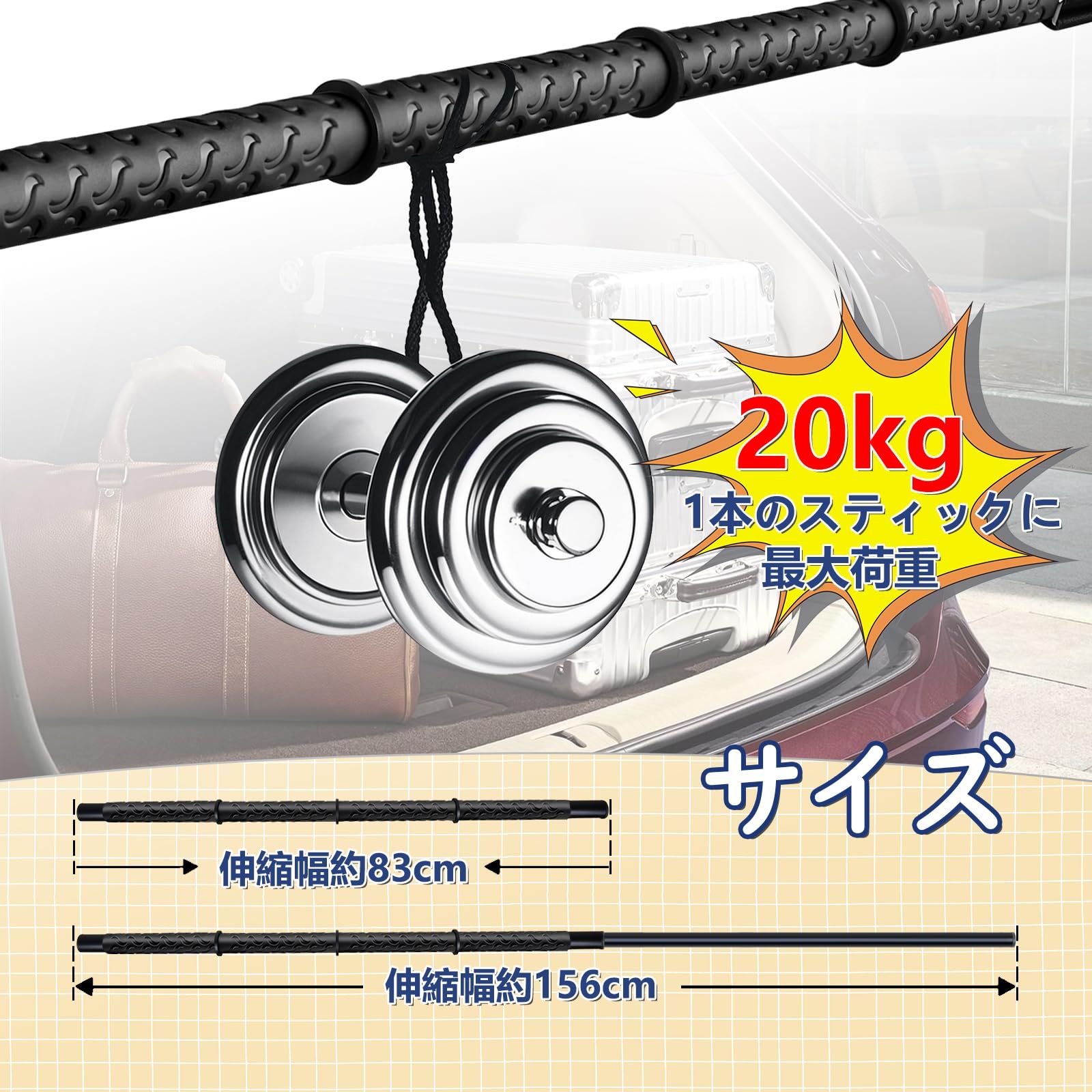 【複数車種対応可能】この車内ルーフバー車に合わせて長さを83~156cmに調整でき、軽自動車からコンパクトカー、トヨタ車に、バン、ゼタン、SUVまで、様々な車種に対応します。最大約20 KG(1本)までの重量に耐えられます。最大の長さが愛車の内幅に近いことを確認してからご購入ください。