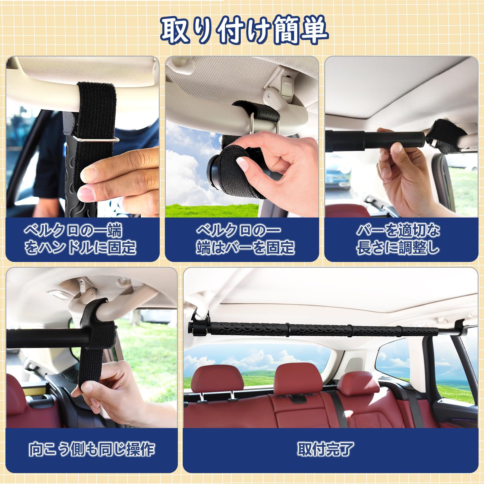 【取り付け簡単】工具不要で、長さを適切に調整してから、アシストグリップにマジックテープで固定するだけで設置完了。伸縮ポール部分はねじることで伸縮可能状態や固定状態に変更可能で、細かい調整や付け外しの際に便利です。