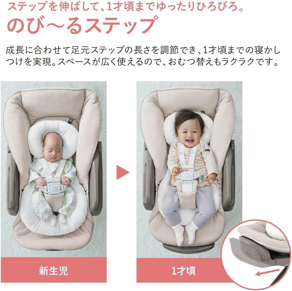 ●1才頃まで使えるオートスウィング・・・「電動性能パワーアップ」*「のびーるステップ」で1才頃までの使用期間を実現。