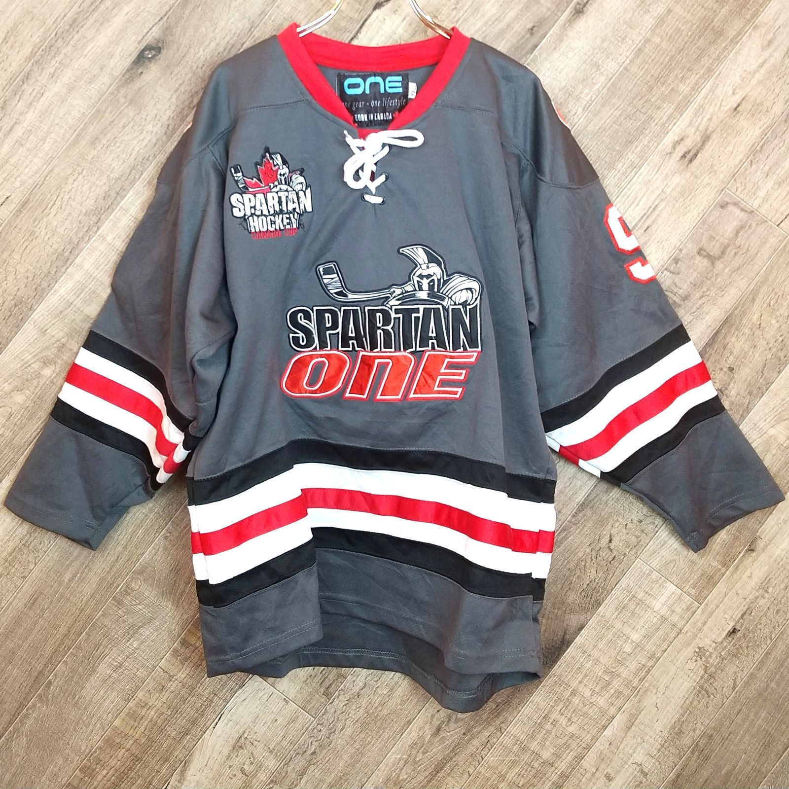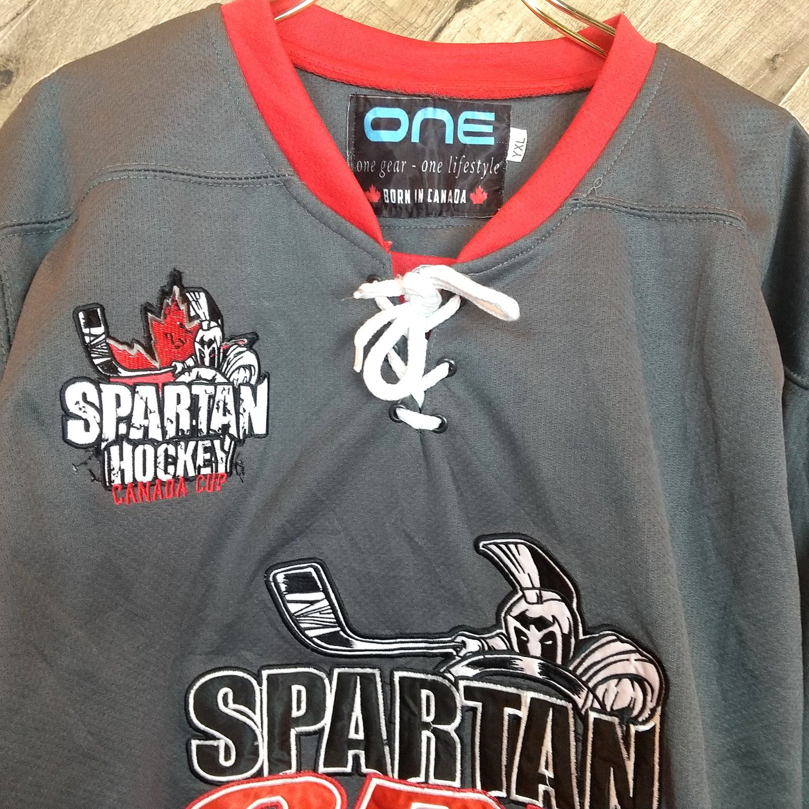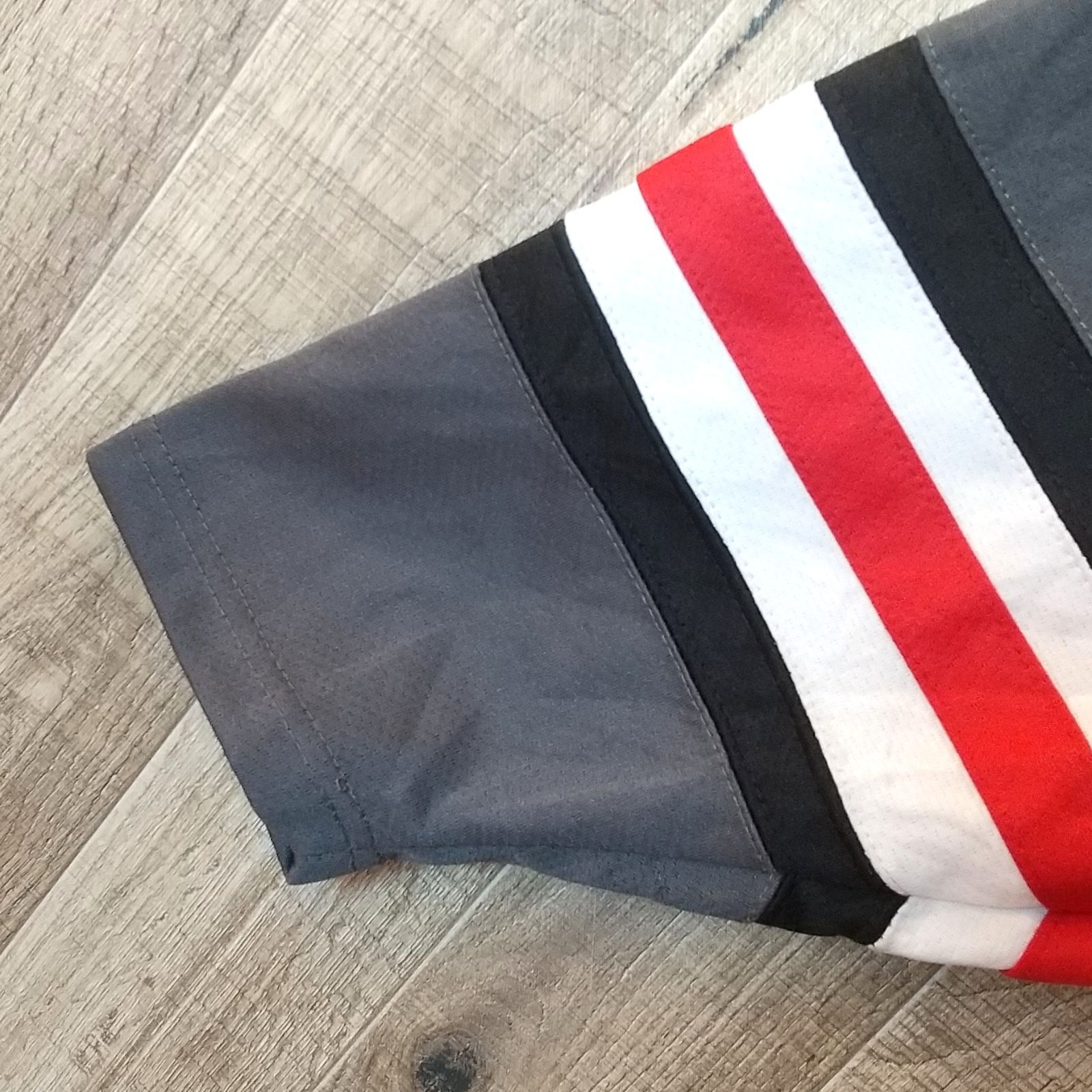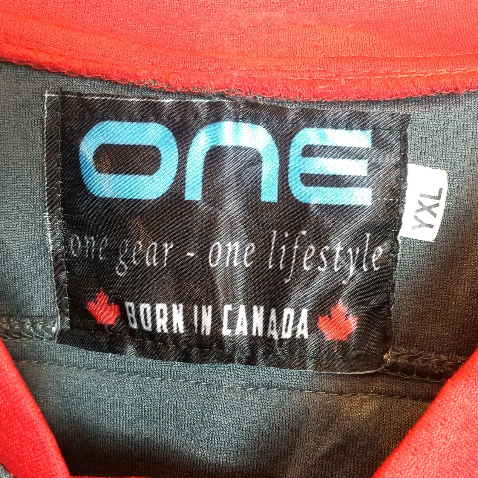 ・商品名:M1-02181【Mens】one(ワン) ホッケーユニホーム (YXL:L相当) / グレー×赤×白 裏、中央サイン有 全体的にほつれ有 左袖穴有 表、左脇スレ有 裏、左上スレ有 N-4