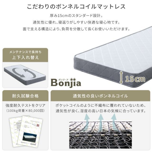 マットレス:ボンネルコイル、不織布、ウレタンフォーム、ニット生地(ポリエステル100%)